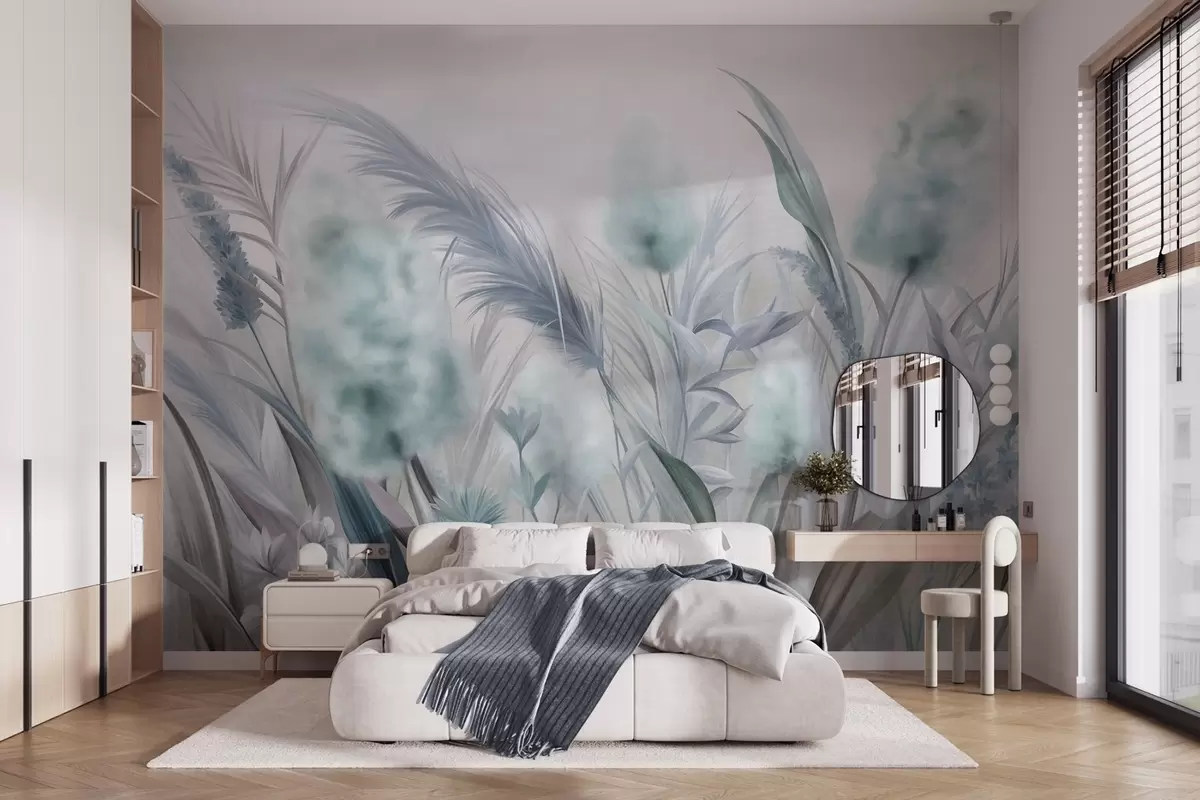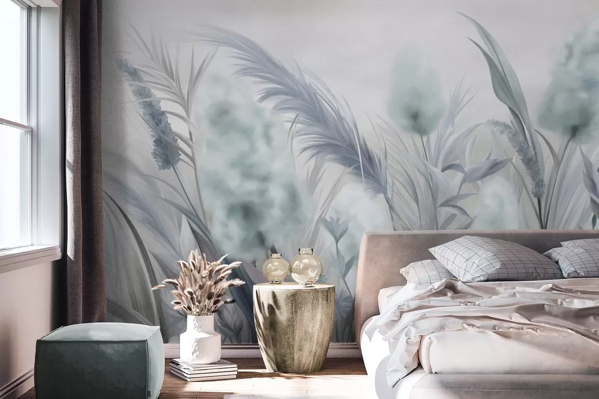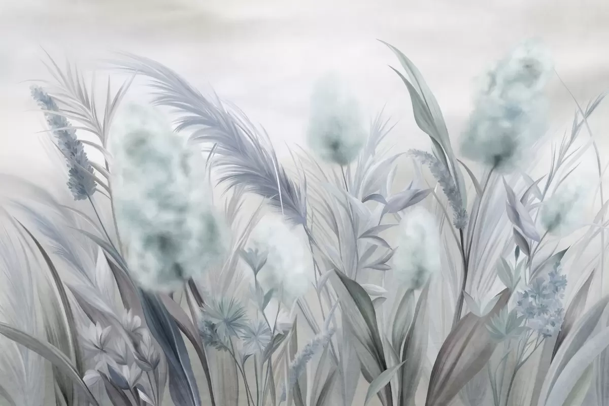 Murais de parede Capim-dos-pampas azul e cinza e outras flores secas com um céu suave e nebuloso ao fundo Nr. w09635v1