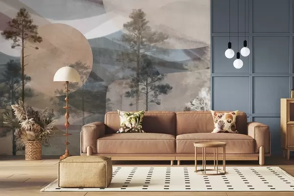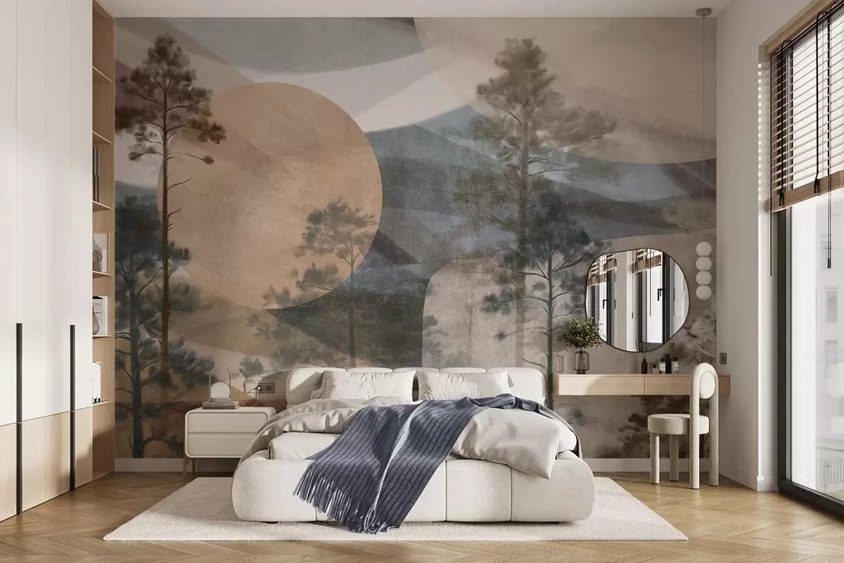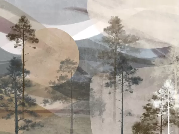 Murais de parede Pinheiros altos em uma paisagem com textura suave, formas circulares abstratas e montanhas em camadas em tons terrosos. Nr. w09636
