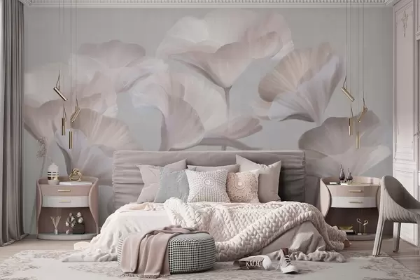 Murais de parede Flores de lótus translúcidas com textura pêssego claro e pétalas delicadas contra um fundo cinza suave Nr. w09640