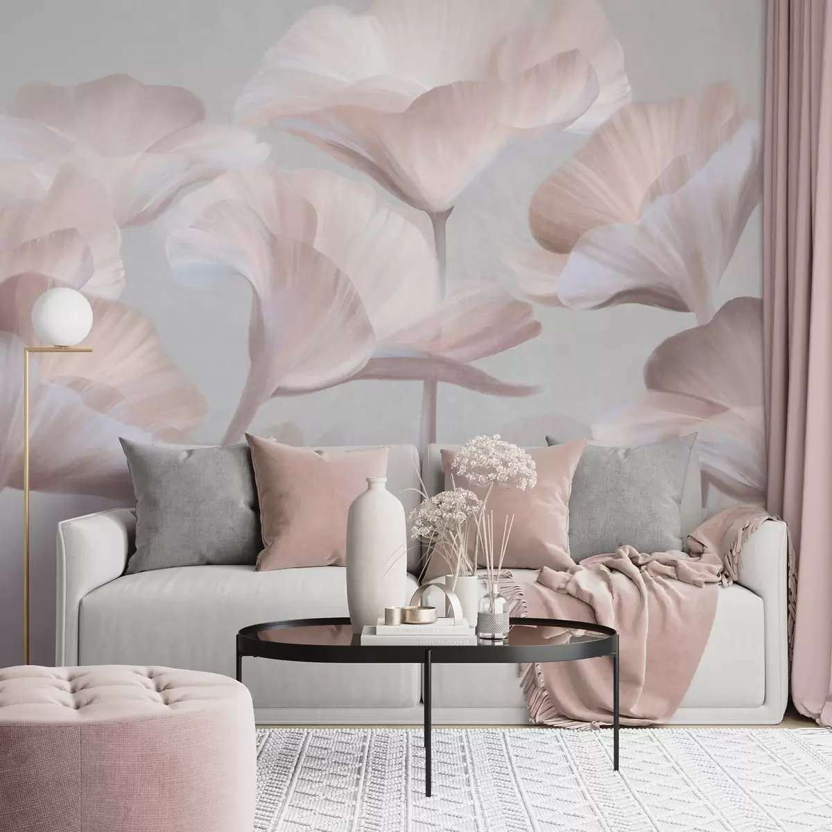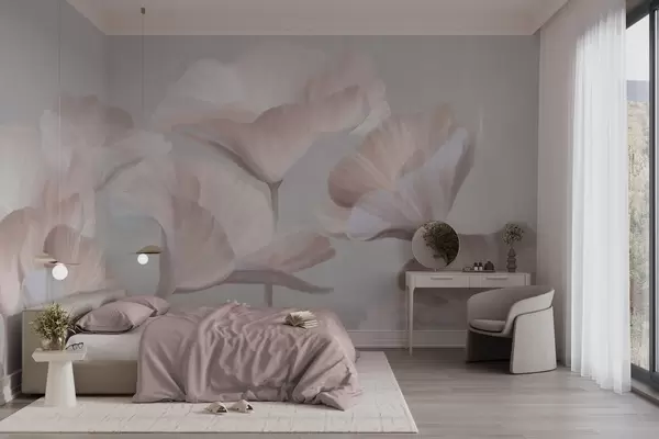Murais de parede Flores de lótus translúcidas com textura pêssego claro e pétalas delicadas contra um fundo cinza suave Nr. w09640