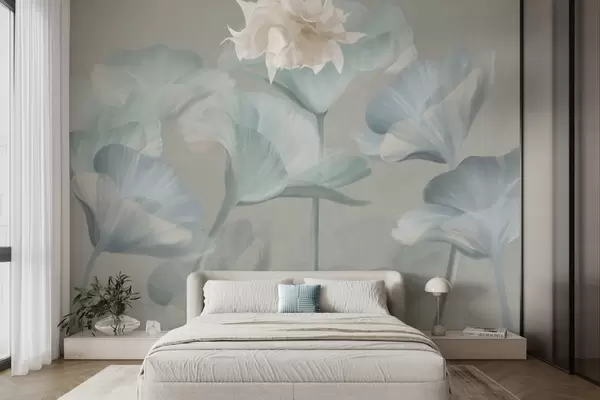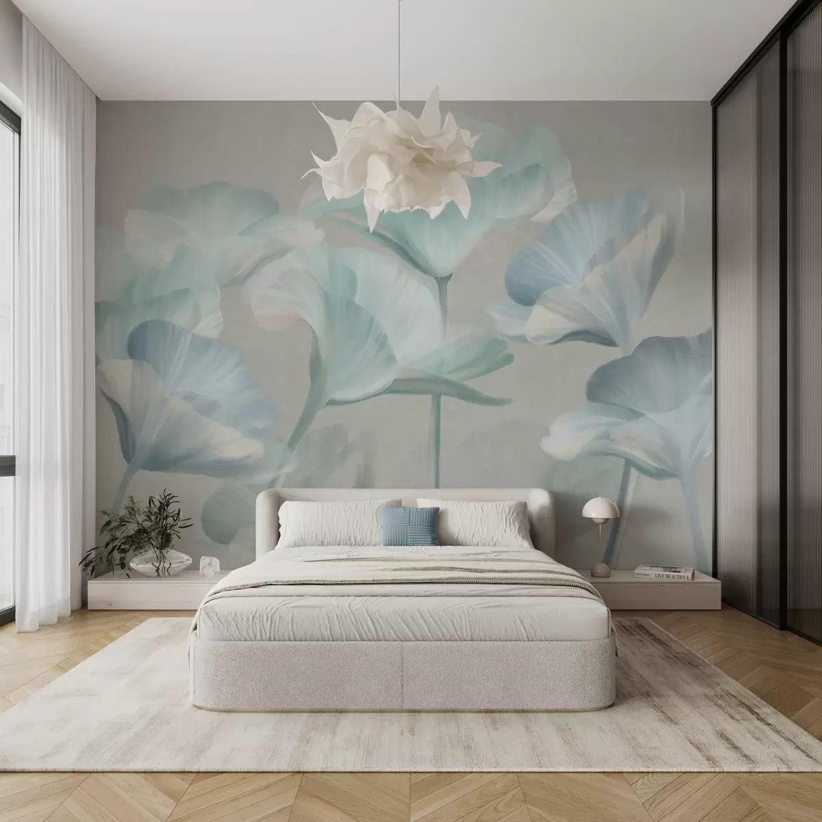 Murais de parede Flores de lótus translúcidas com textura turquesa clara e pétalas delicadas contra um fundo cinza suave Nr. w09640v2