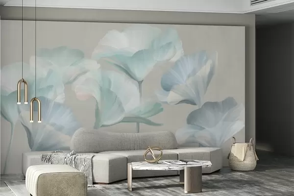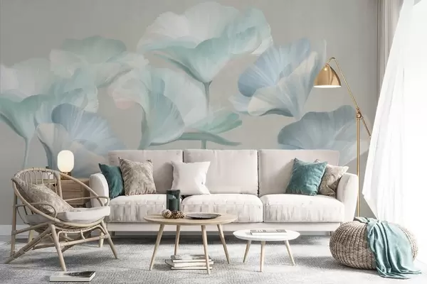 Murais de parede Flores de lótus translúcidas com textura turquesa clara e pétalas delicadas contra um fundo cinza suave Nr. w09640v2