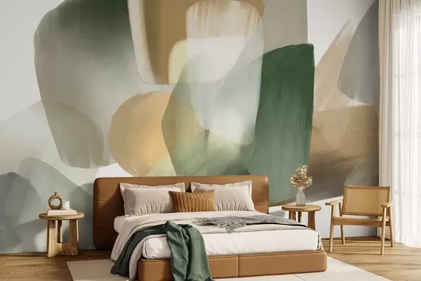 Murais de parede Formas abstratas texturizadas em tons suaves de verde e bege, com bordas suaves e camadas sobrepostas. Nr. w09642