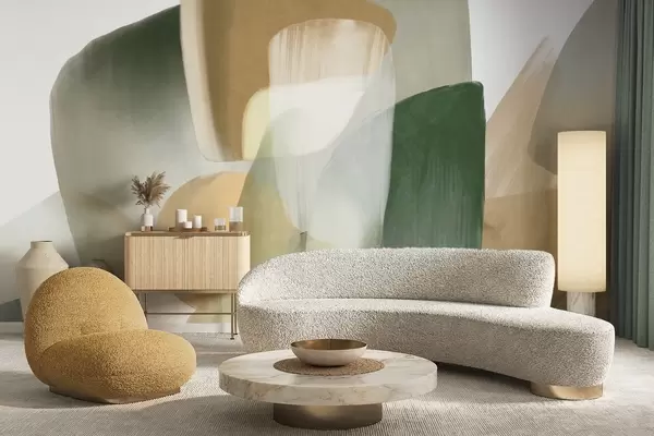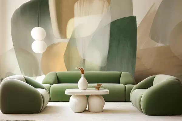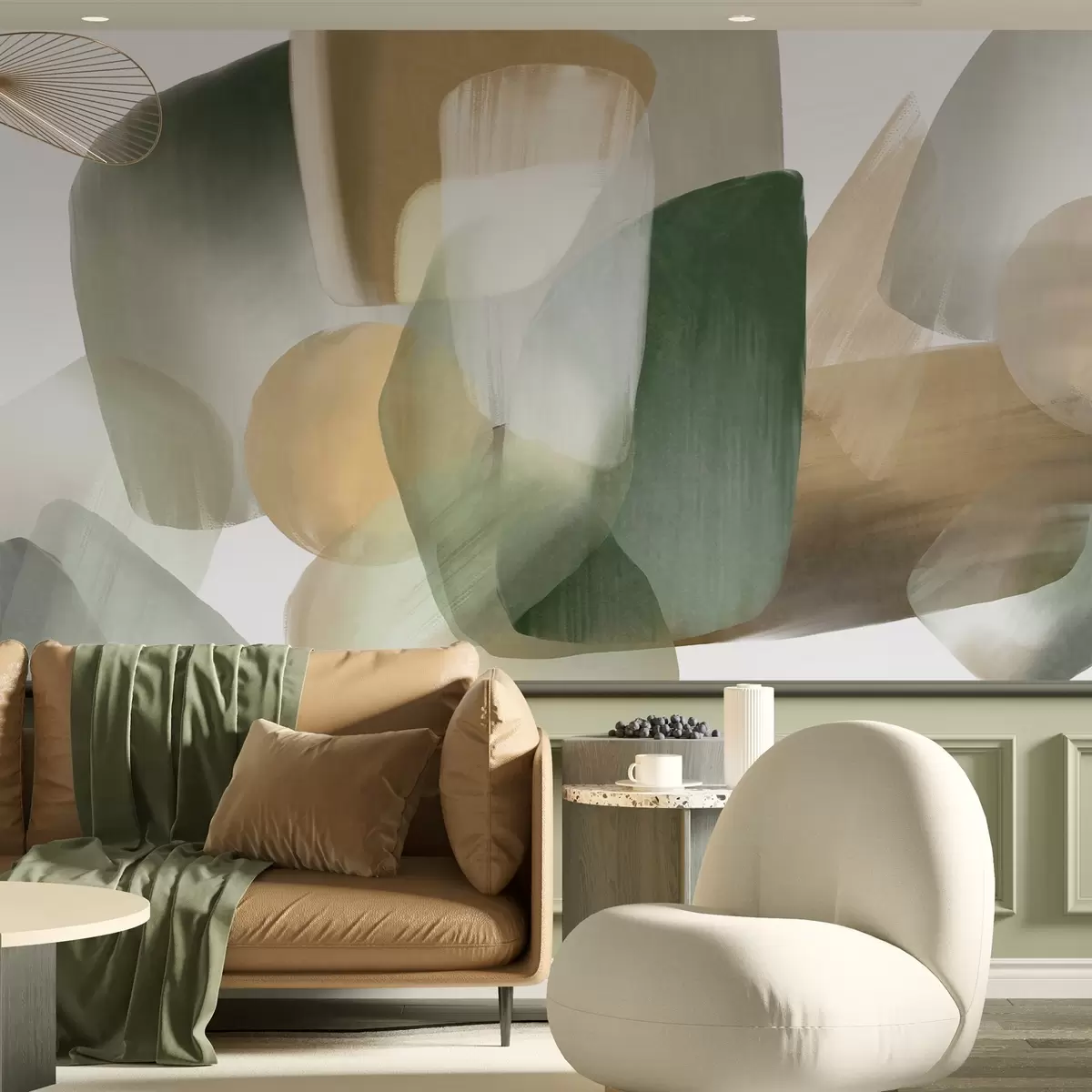 Murais de parede Formas abstratas texturizadas em tons suaves de verde e bege, com bordas suaves e camadas sobrepostas. Nr. w09642