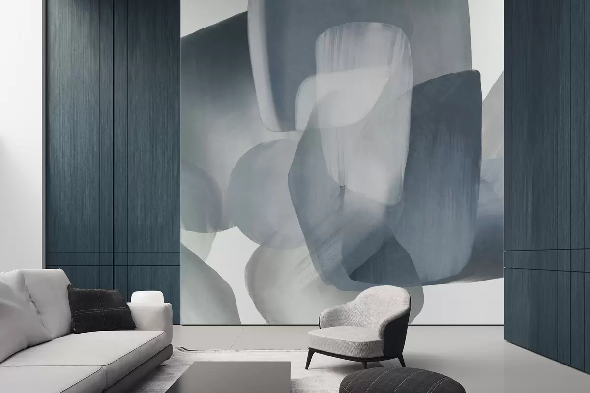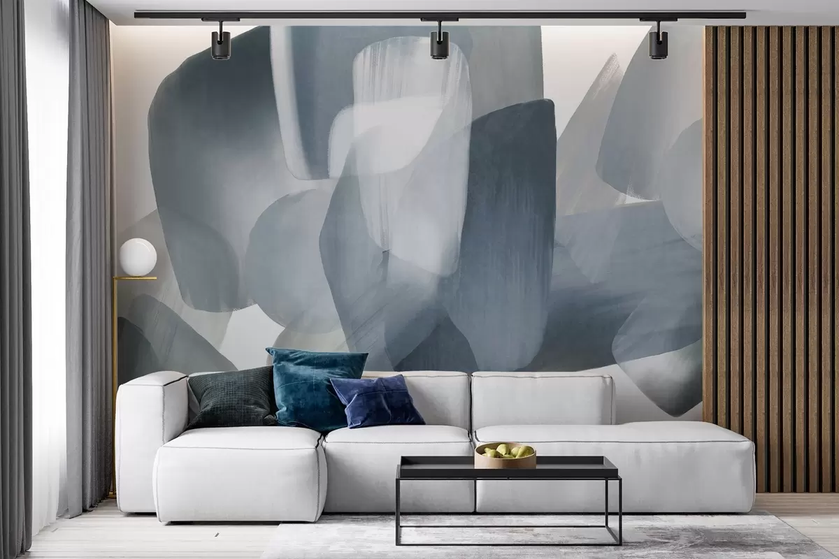 Murais de parede Formas abstratas texturizadas em tons suaves de azul e cinza, com bordas suaves e camadas sobrepostas. Nr. w09642v1