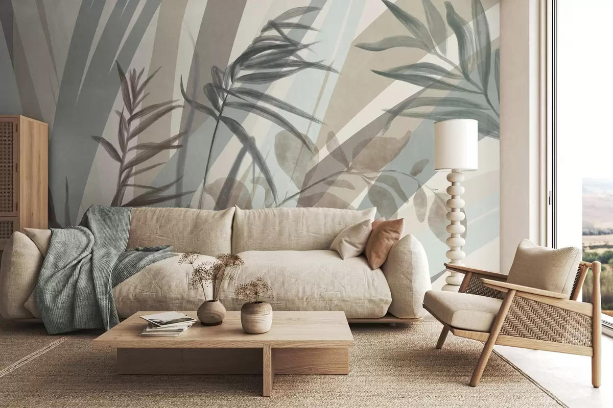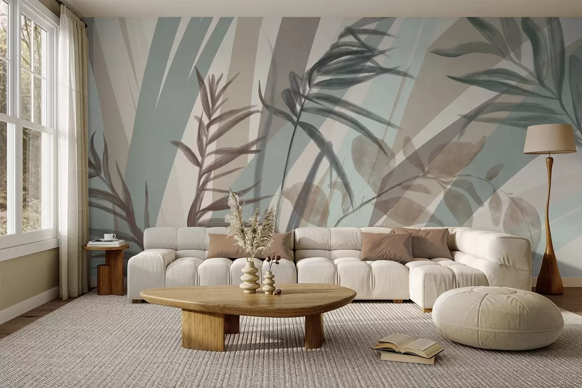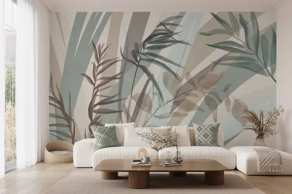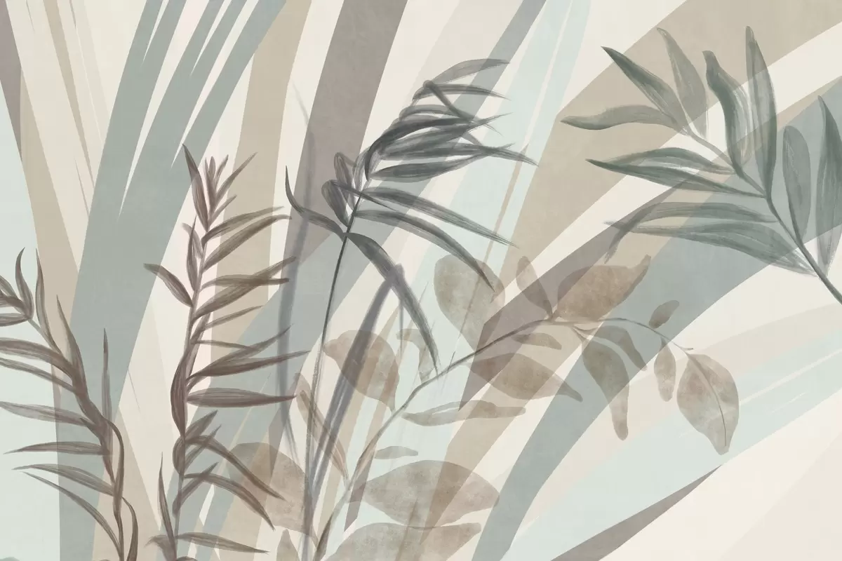 Murais de parede Grama alta texturizada e folhas em tons terrosos suaves, com linhas abstratas no fundo, criando uma estampa orgânica. Nr. w09643