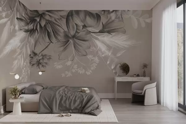 Murais de parede Flores e samambaias texturizadas em tons de cinza escuro e branco contra um fundo bege suave, estilo de desenho Nr. w09644
