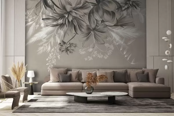 Murais de parede Flores e samambaias texturizadas em tons de cinza escuro e branco contra um fundo bege suave, estilo de desenho Nr. w09644