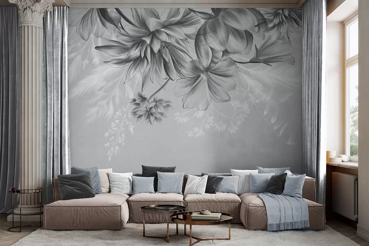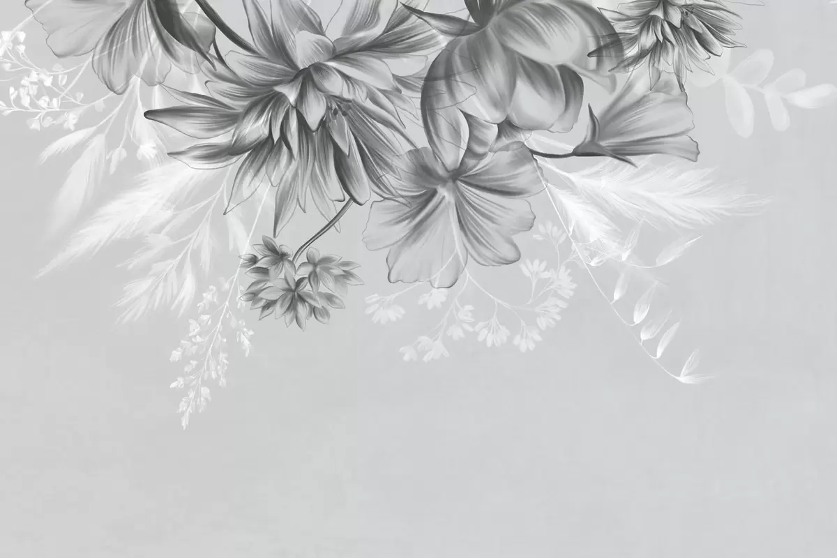Murais de parede Flores e samambaias texturizadas em tons de cinza escuro e branco contra um fundo cinza suave, estilo de desenho. Nr. w09644v1
