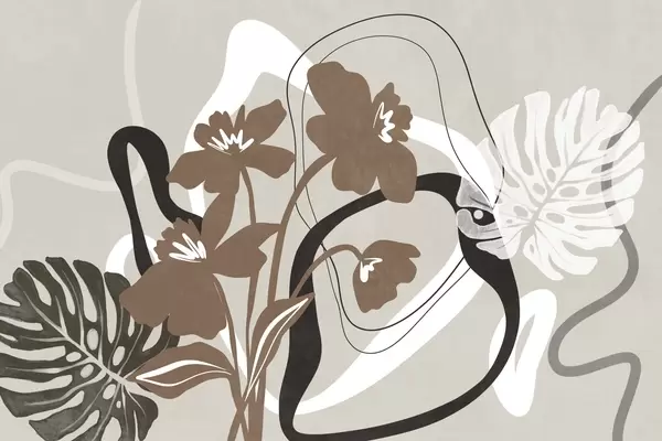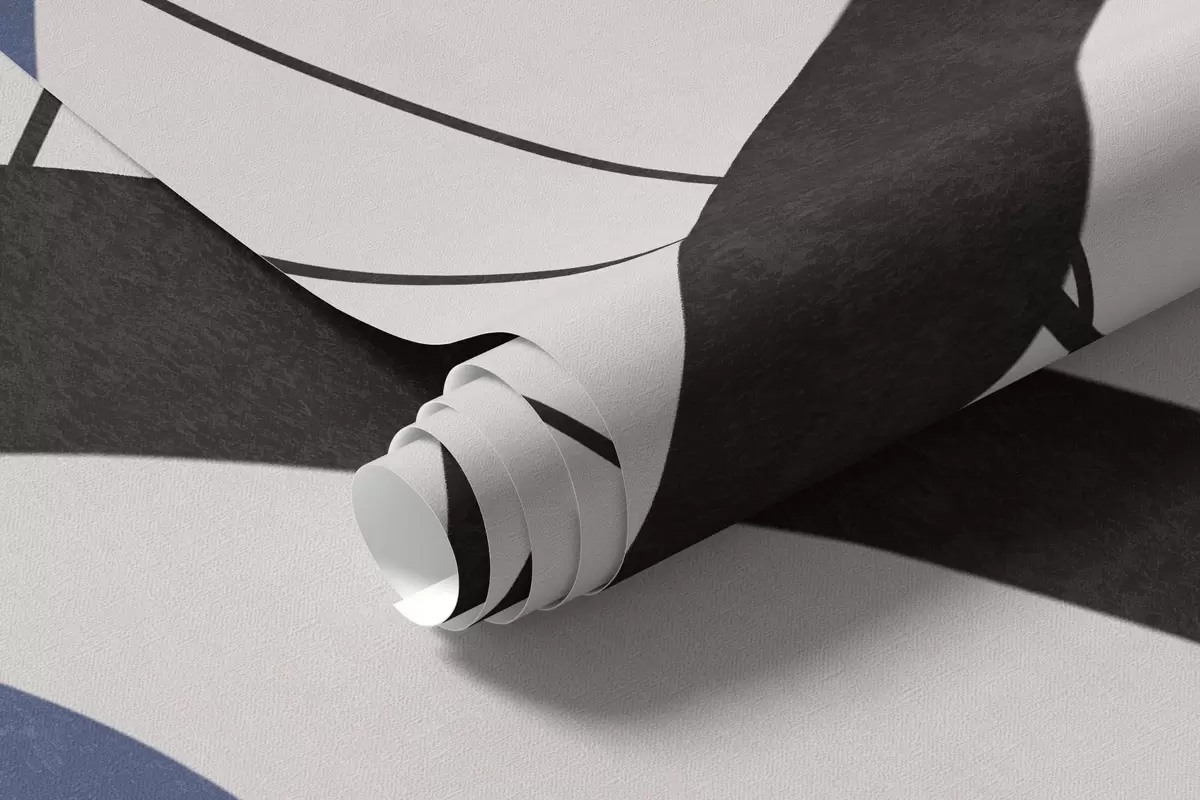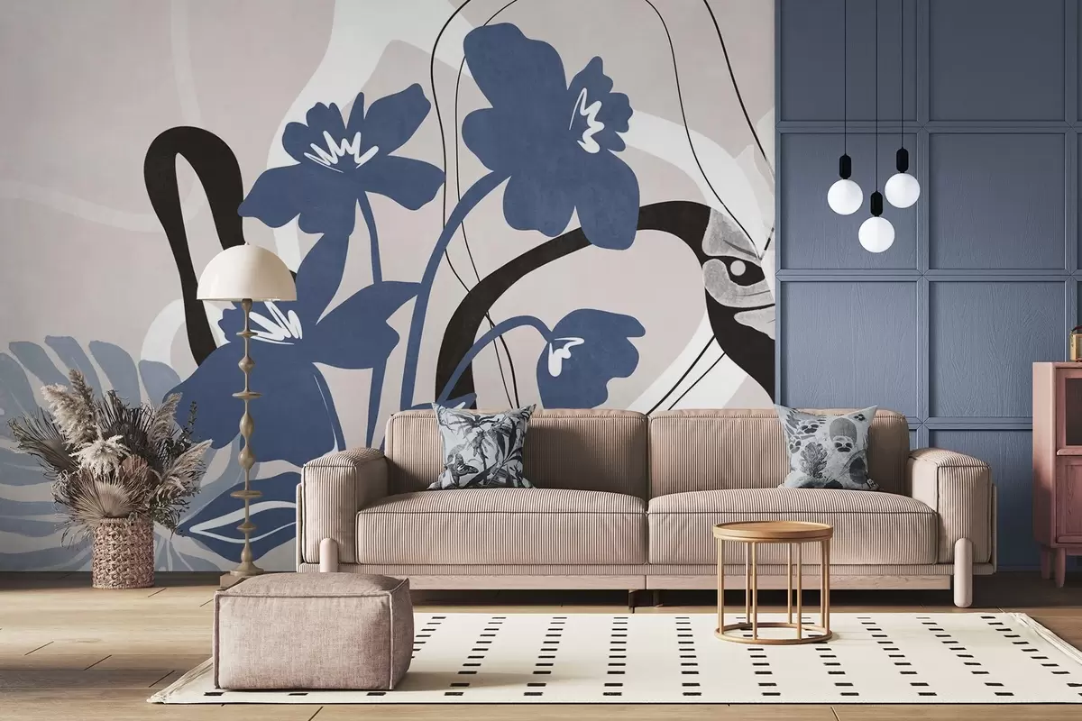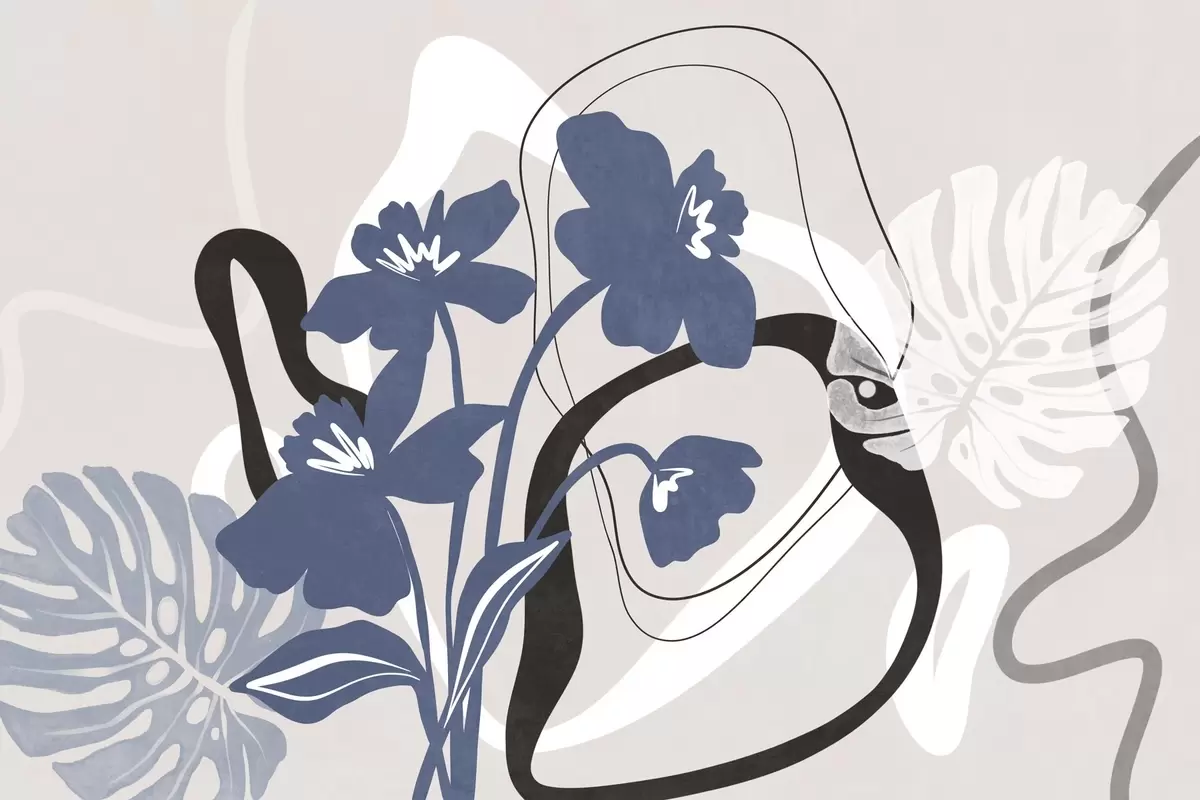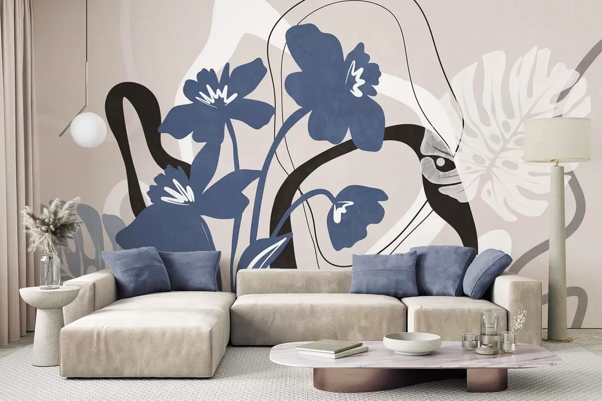 Murais de parede Flores azuis abstratas com textura e formas brancas e pretas sobre um fundo bege claro, arte minimalista Nr. w09645