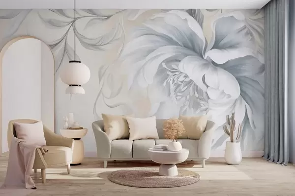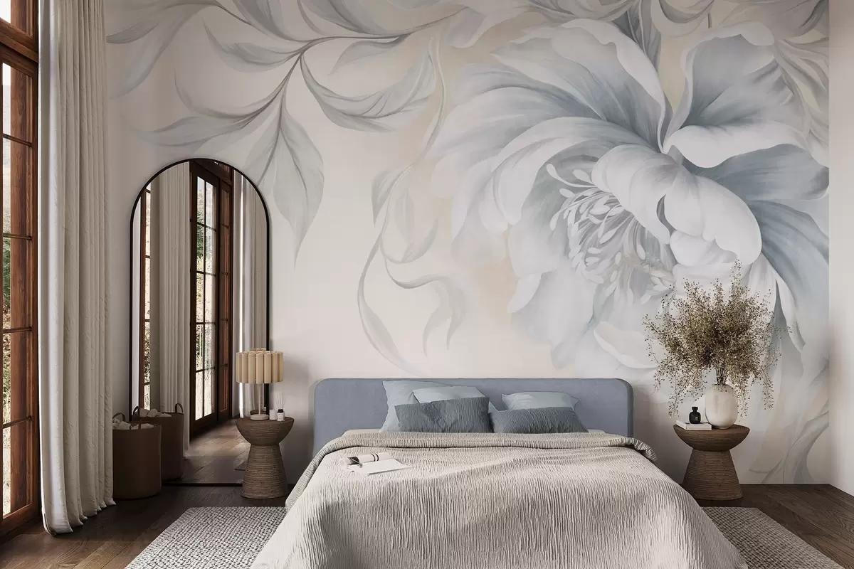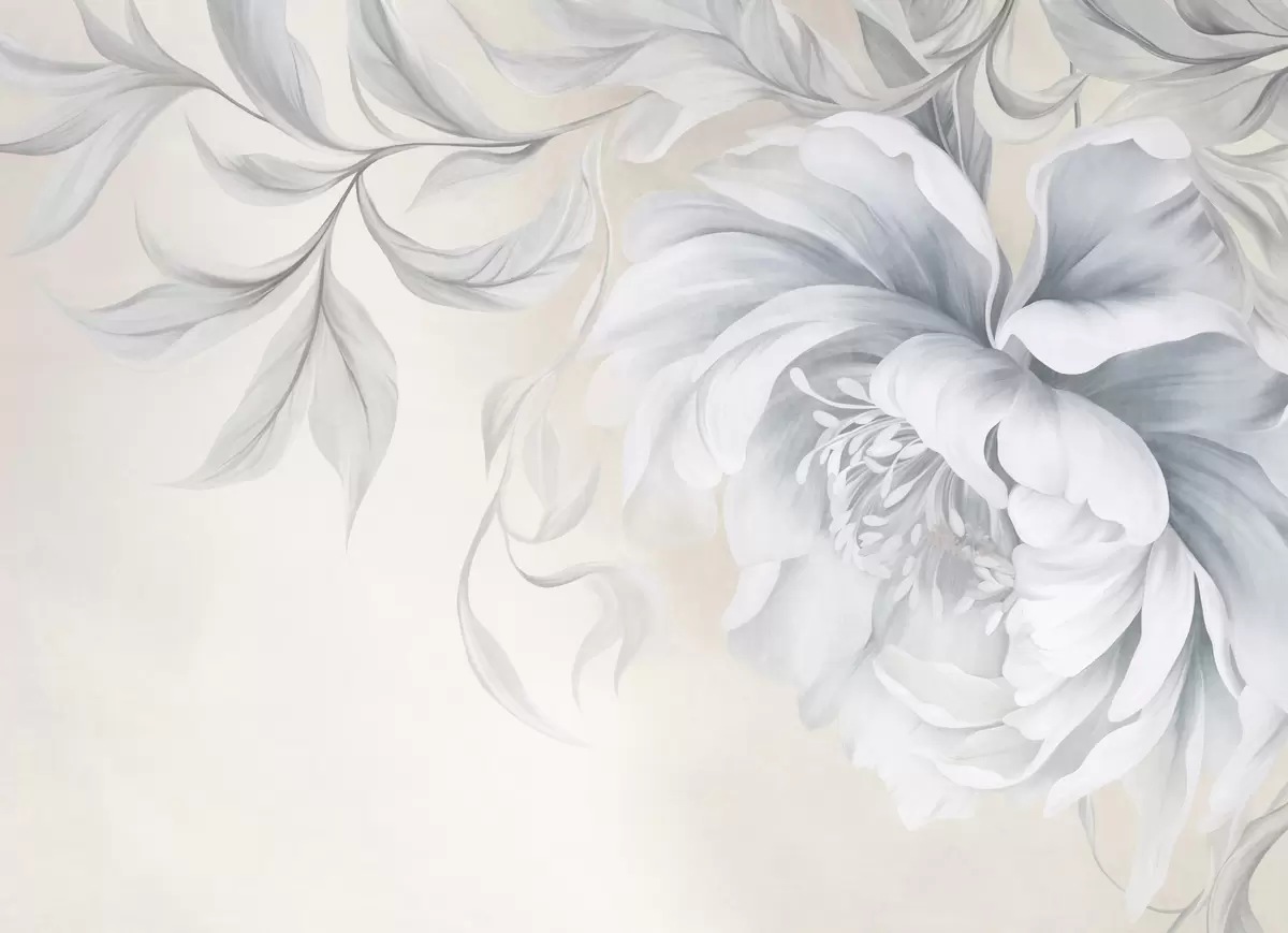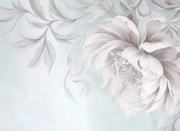 Murais de parede Peônia grande e texturizada, com pétalas delicadas e folhas cinzentas, pintada em estilo suave Nr. w09647