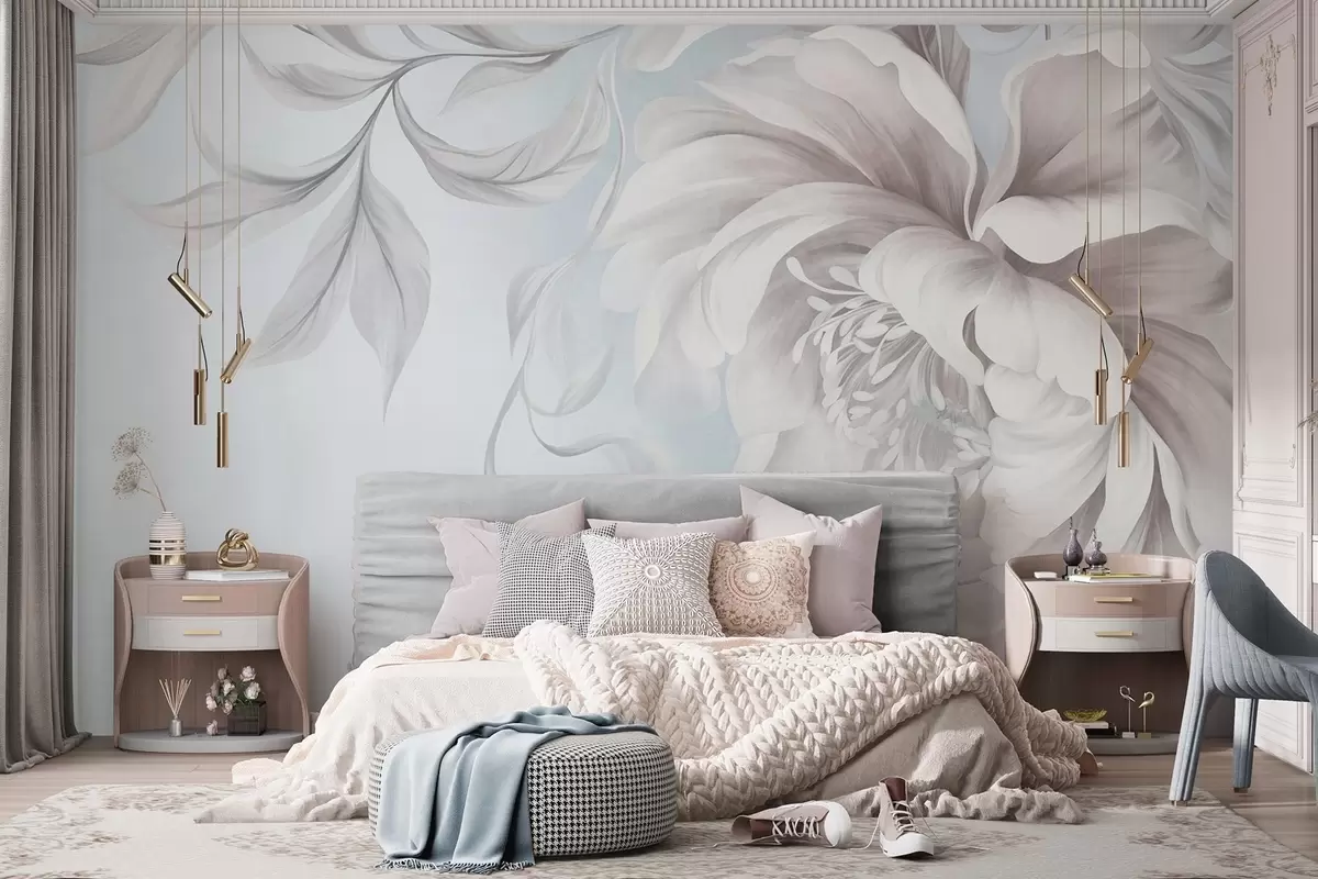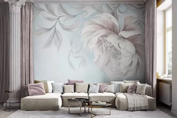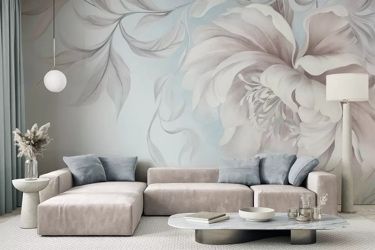 Murais de parede Peônia grande e texturizada, com pétalas delicadas e folhas cinzentas, pintada em estilo suave Nr. w09647v1