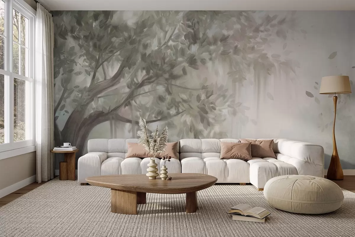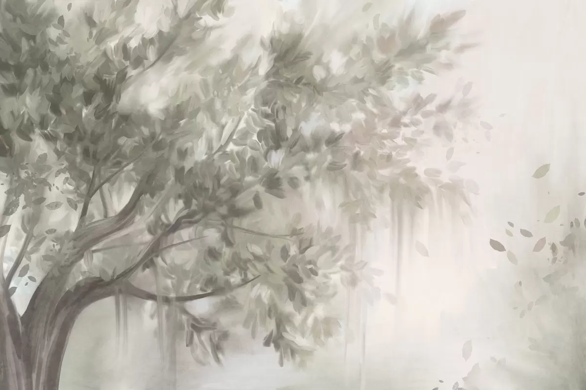Murais de parede Árvore texturizada com folhas e galhos verdes claros, com um fundo suave e nebuloso Nr. w09650