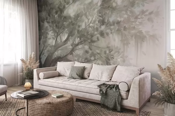 Murais de parede Árvore texturizada com folhas e galhos verdes claros, com um fundo suave e nebuloso Nr. w09650