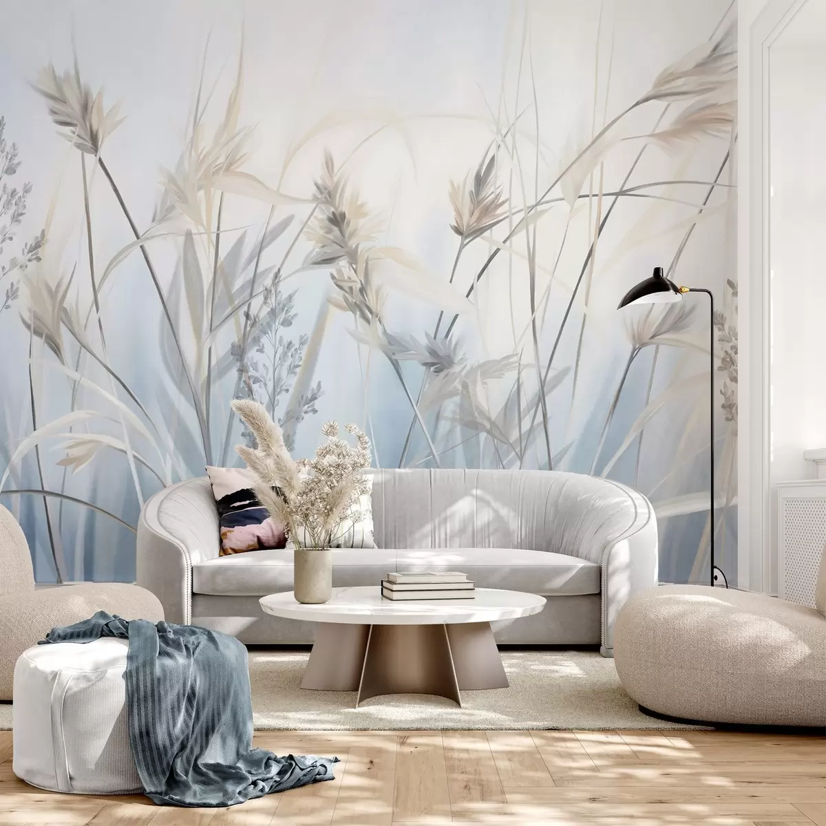 Murais de parede Talos altos e secos de grama com pontas plumosas em tons suaves, fundo azul e branco suave e nebuloso Nr. w09652