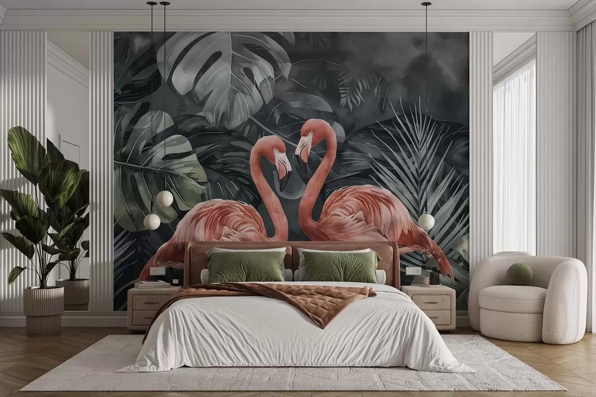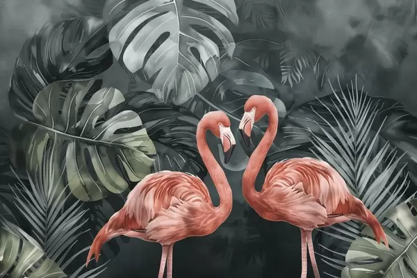 Murais de parede Um casal de flamingos entre plantas tropicais Nr. w09687