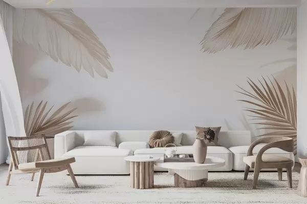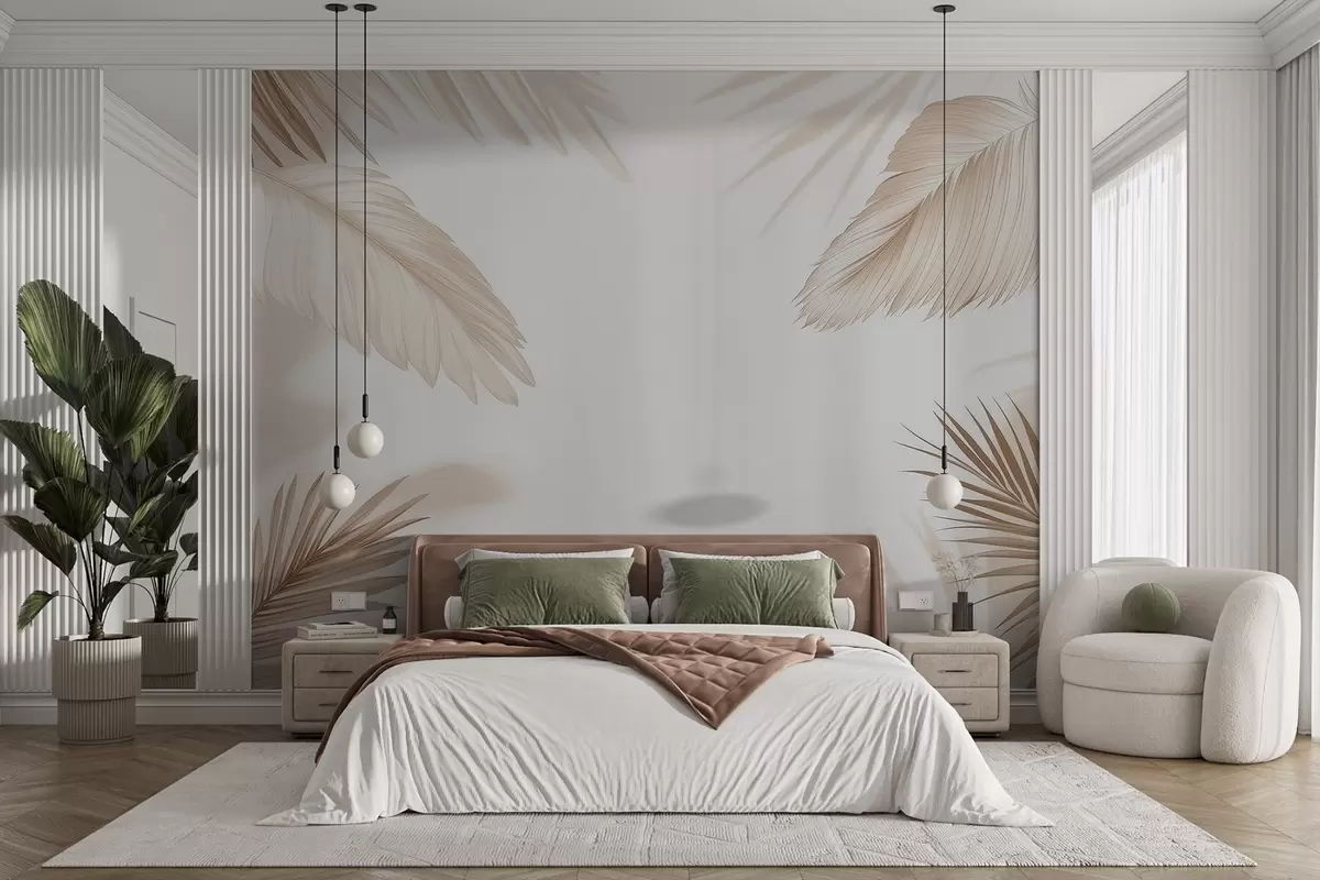 Murais de parede Decoração tropical em tons de bege com silhuetas de folhas de palmeira e sombras suaves Nr. w09714
