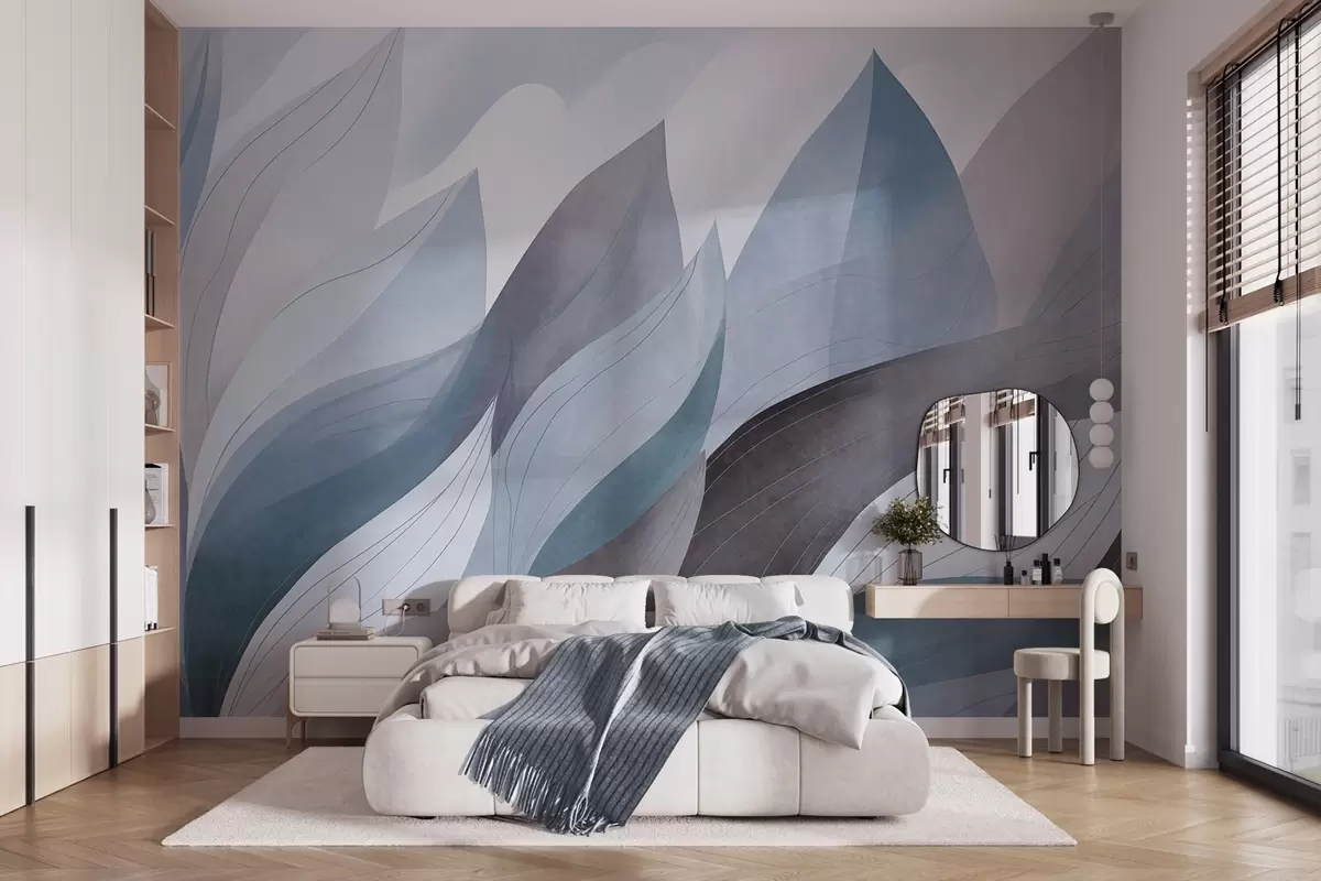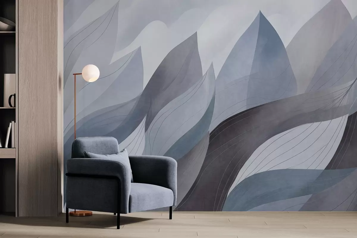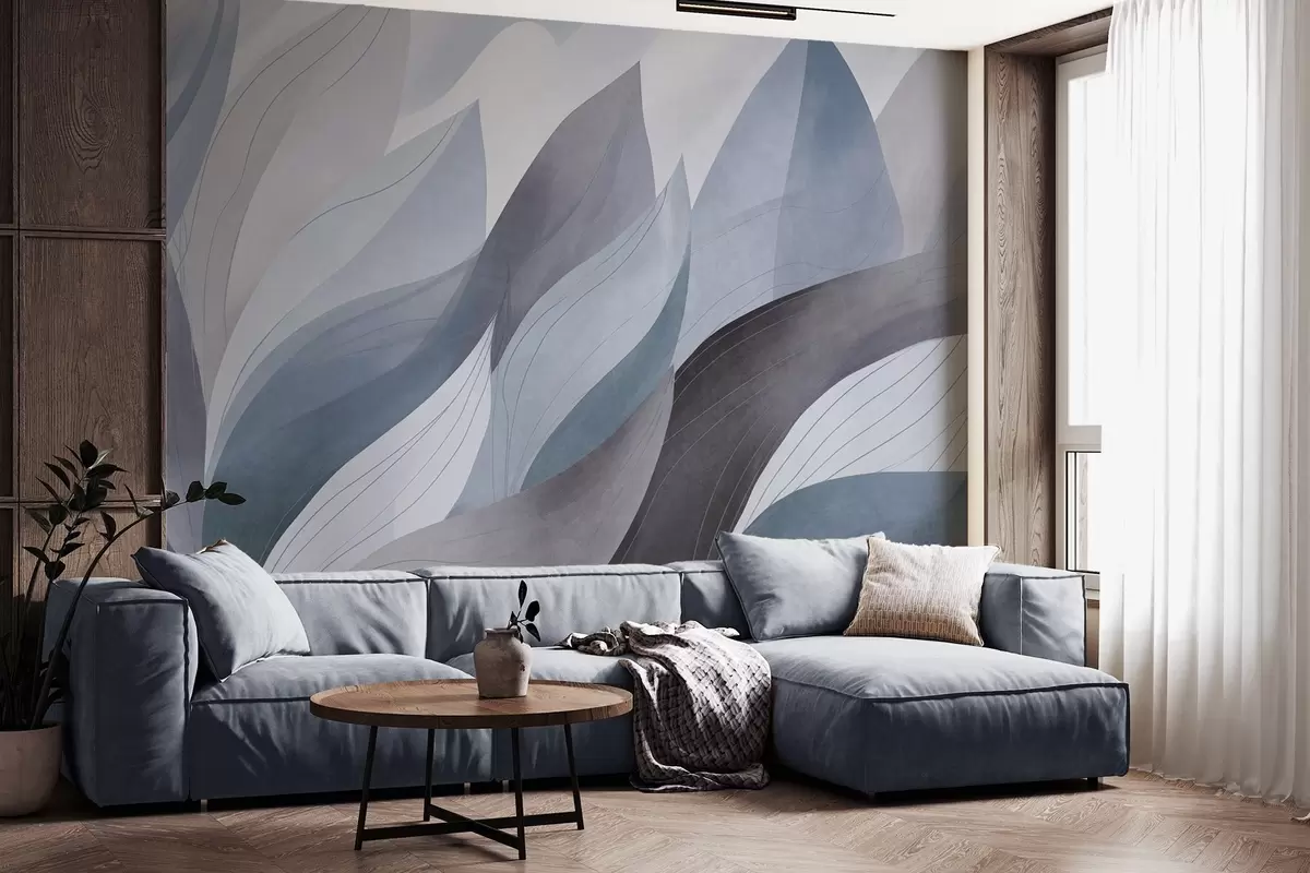 Murais de parede Folhas abstratas, tons terrosos suaves de azul com detalhes delicados em linhas, textura suave de aquarela Nr. w09736v1
