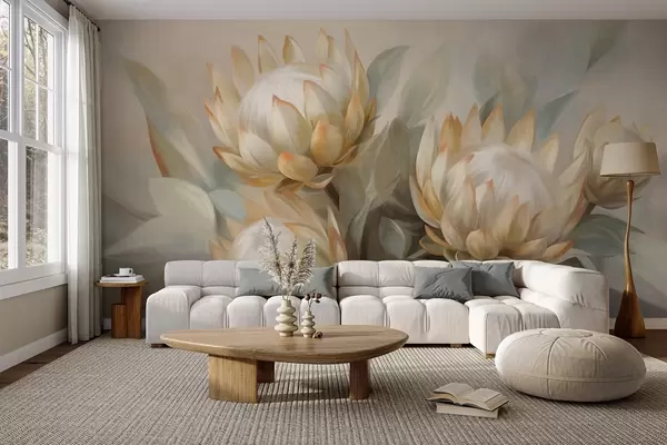 Murais de parede Flores protea texturizadas com folhas verdes e um fundo suave e desfocado Nr. w09738