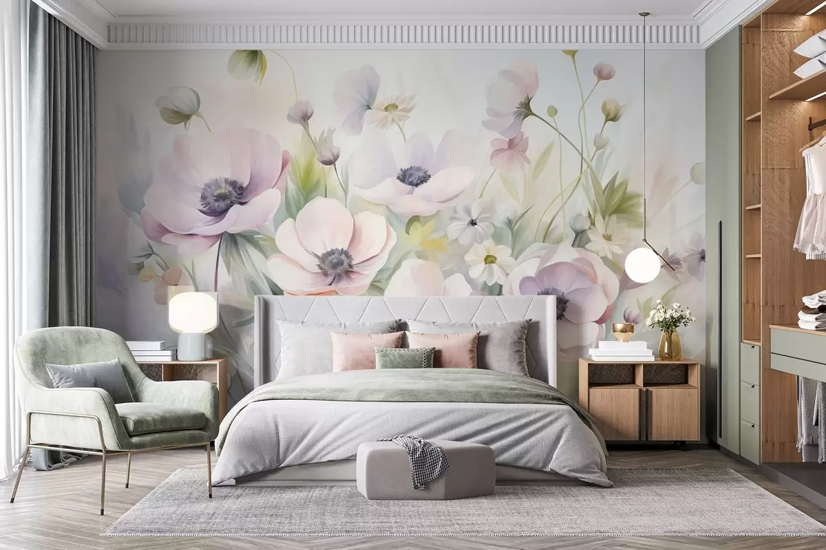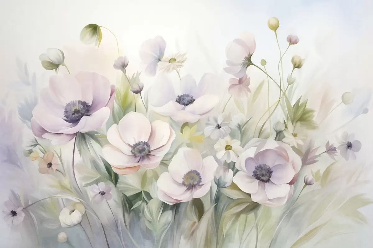 Murais de parede Um campo de flores anêmonas em tons de rosa pastel e branco, folhagem verde e pequenas margaridas brancas. Nr. w09742