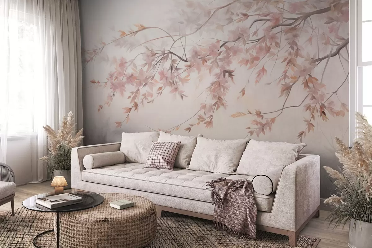 Murais de parede Paisagem texturizada com galho de cerejeira em flor, folhas rosadas e fundo suave e nebuloso Nr. w09743