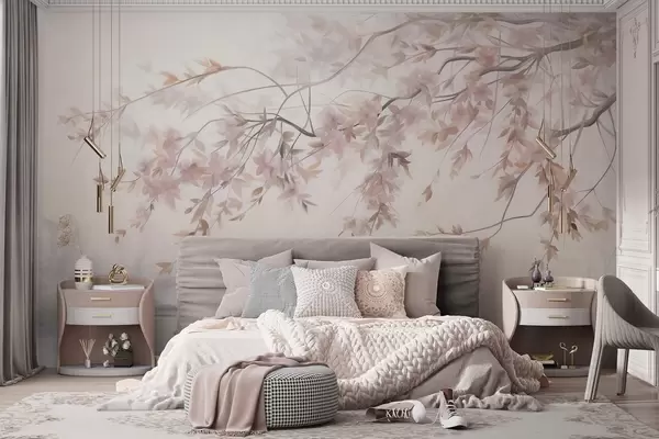 Murais de parede Paisagem texturizada com galho de cerejeira em flor, folhas rosadas e fundo suave e nebuloso Nr. w09743