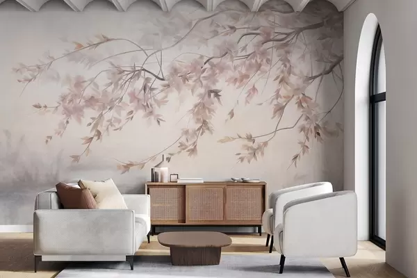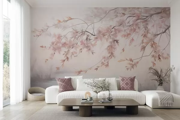 Murais de parede Paisagem texturizada com galho de cerejeira em flor, folhas rosadas e fundo suave e nebuloso Nr. w09743