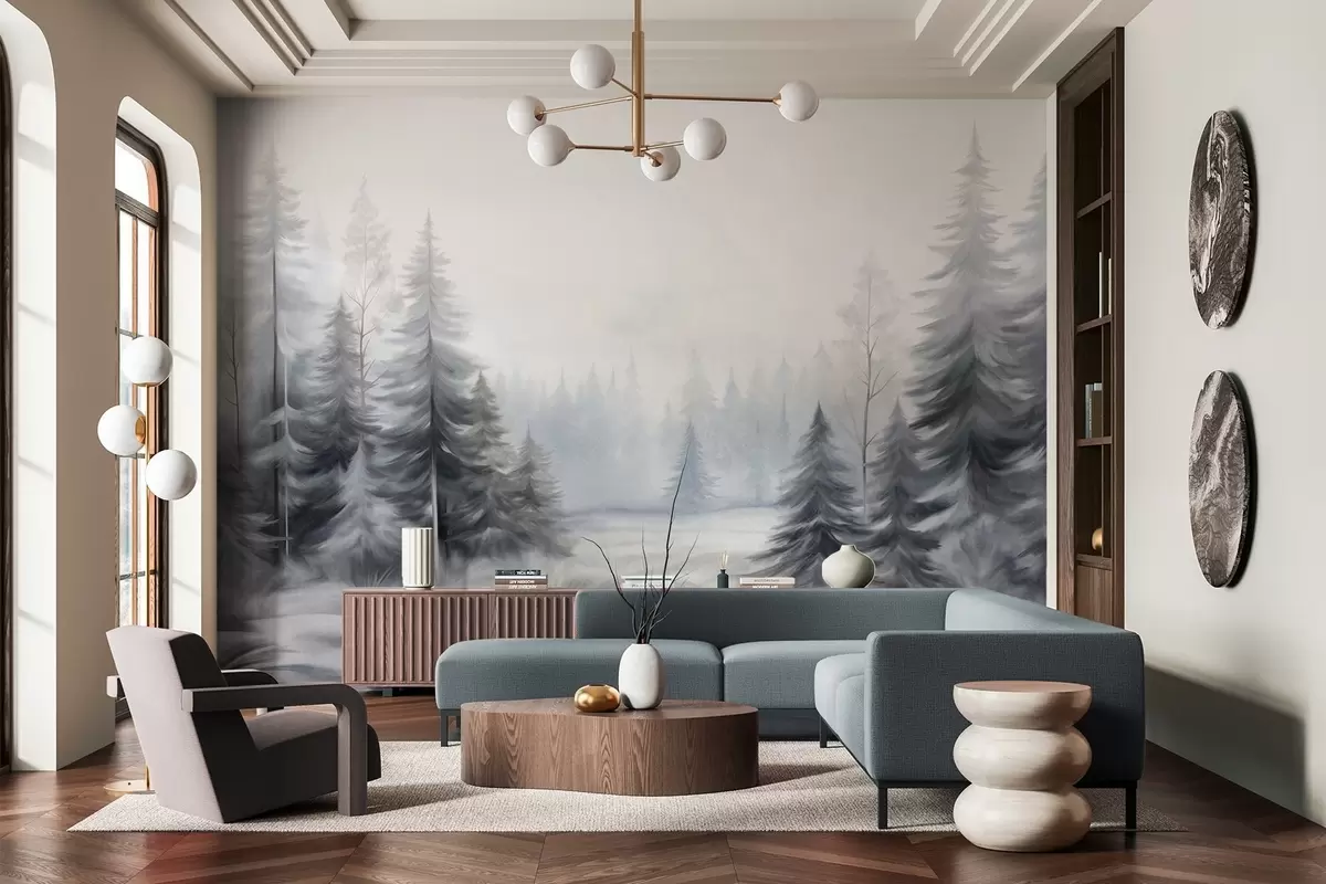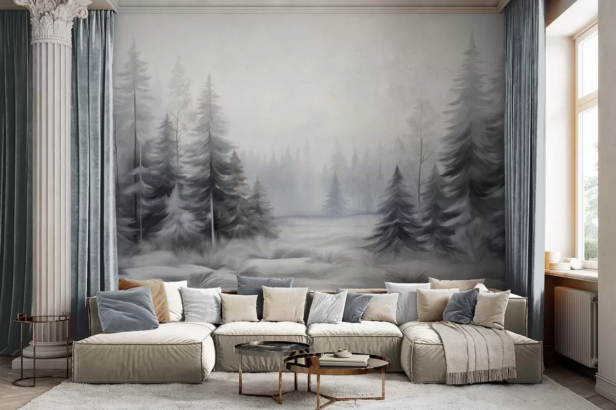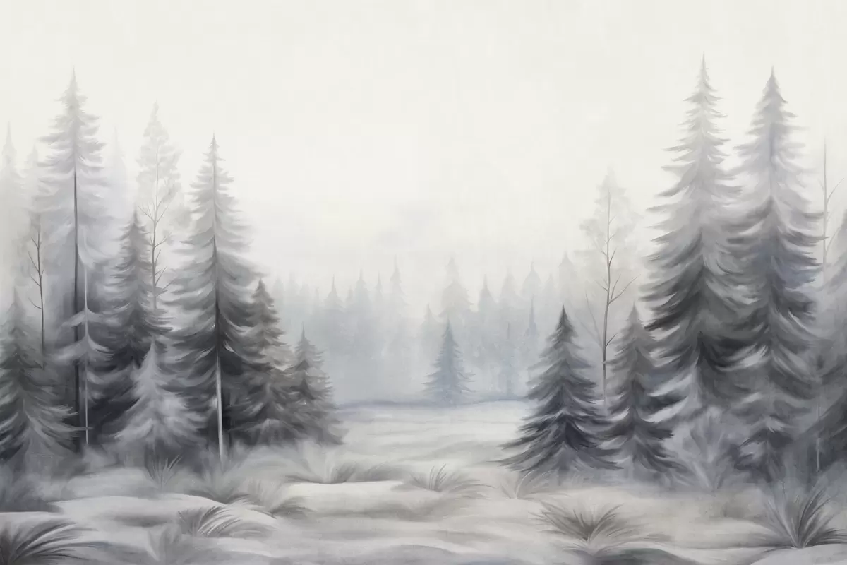 Murais de parede Árvores texturizadas de uma floresta no inverno envolta em névoa, em tons suaves de cinza e branco Nr. w09745