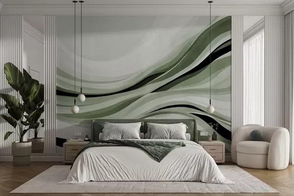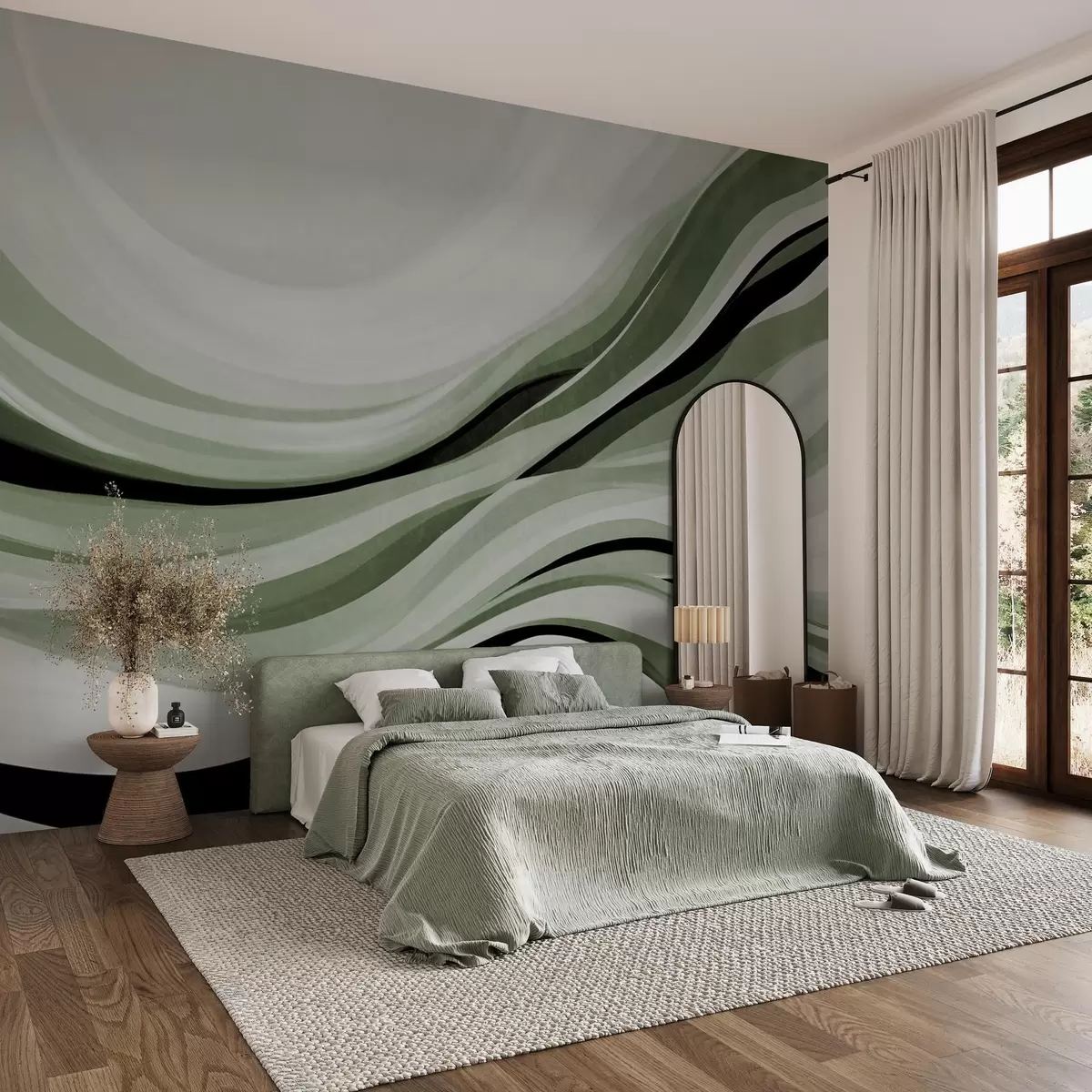 Murais de parede Linhas abstratas onduladas em tons de verde e preto contra um fundo claro, arte texturizada Nr. w09748v1