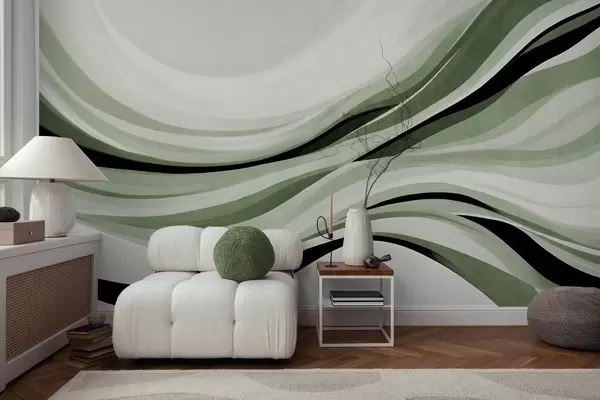 Murais de parede Linhas abstratas onduladas em tons de verde e preto contra um fundo claro, arte texturizada Nr. w09748v1