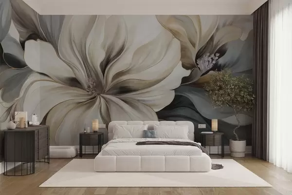 Murais de parede Grandes flores cremosas de magnólia com folhas marrons e cinzentas, iluminação suave, fundo abstrato Nr. w09749