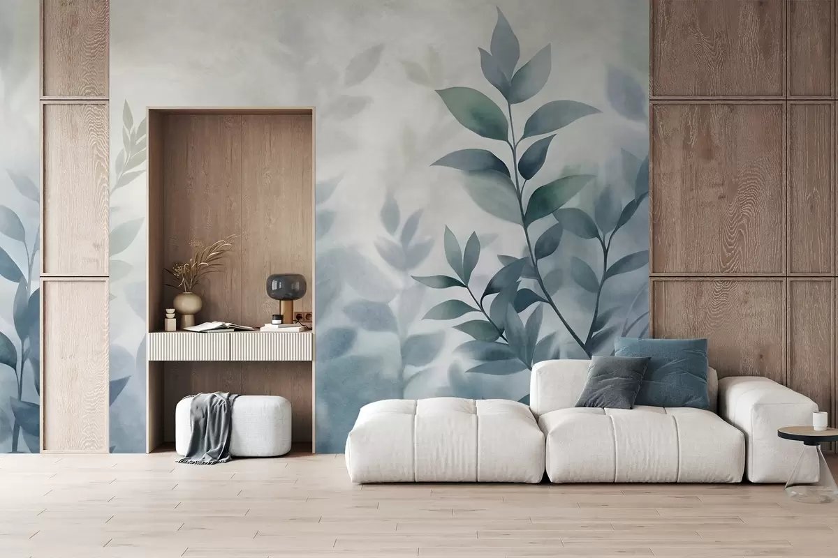Murais de parede Galhos delicados com folhas azuis suaves, estilo pintura em aquarela, arte texturizada Nr. w09750v1