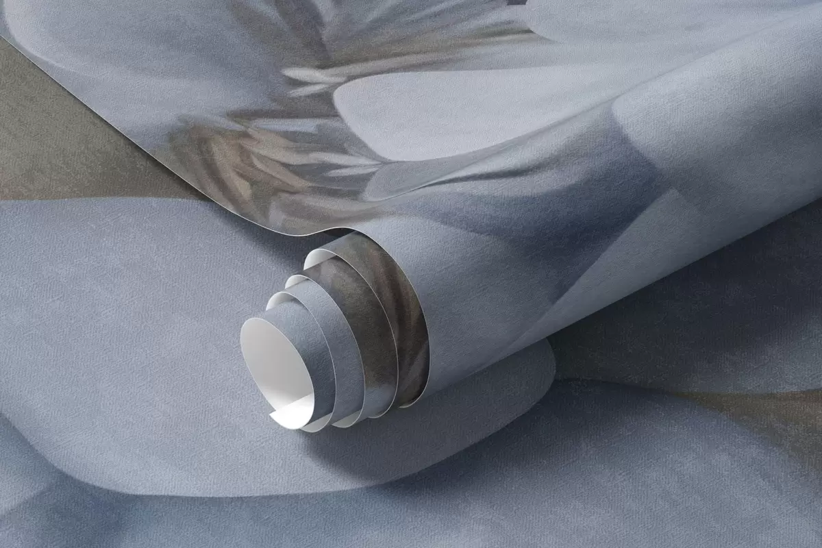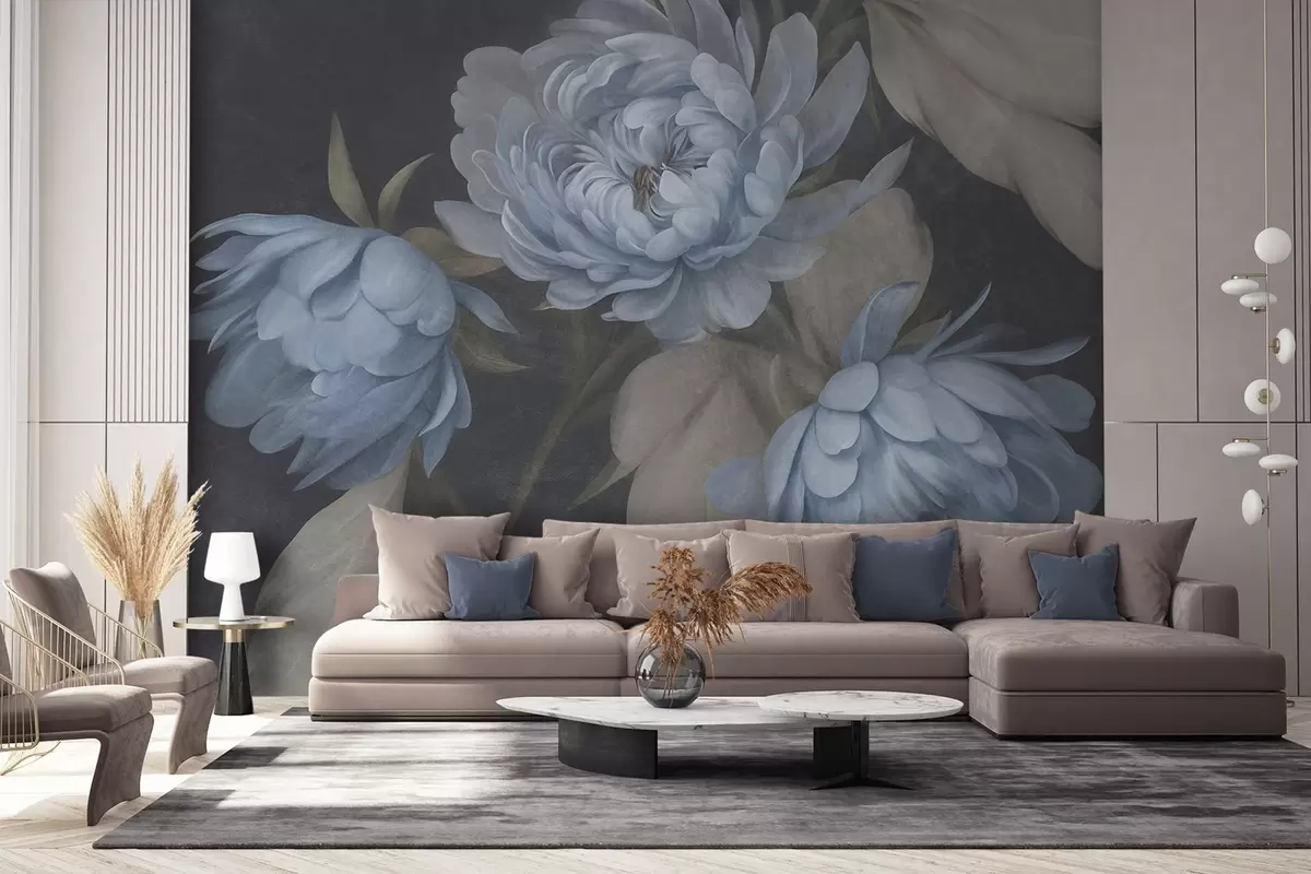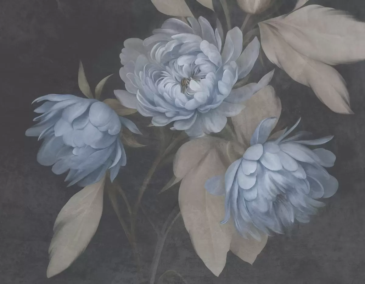 Murais de parede Flores de peônia em tom de azul claro com textura e folhas bege sobre um fundo escuro Nr. w09751