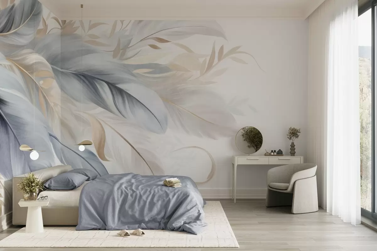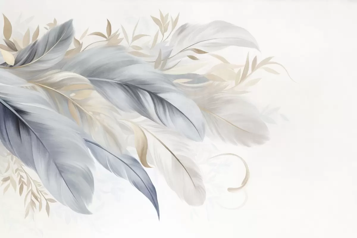 Murais de parede Penas texturizadas em tons pastéis e folhas delicadas contra um fundo claro Nr. w09763