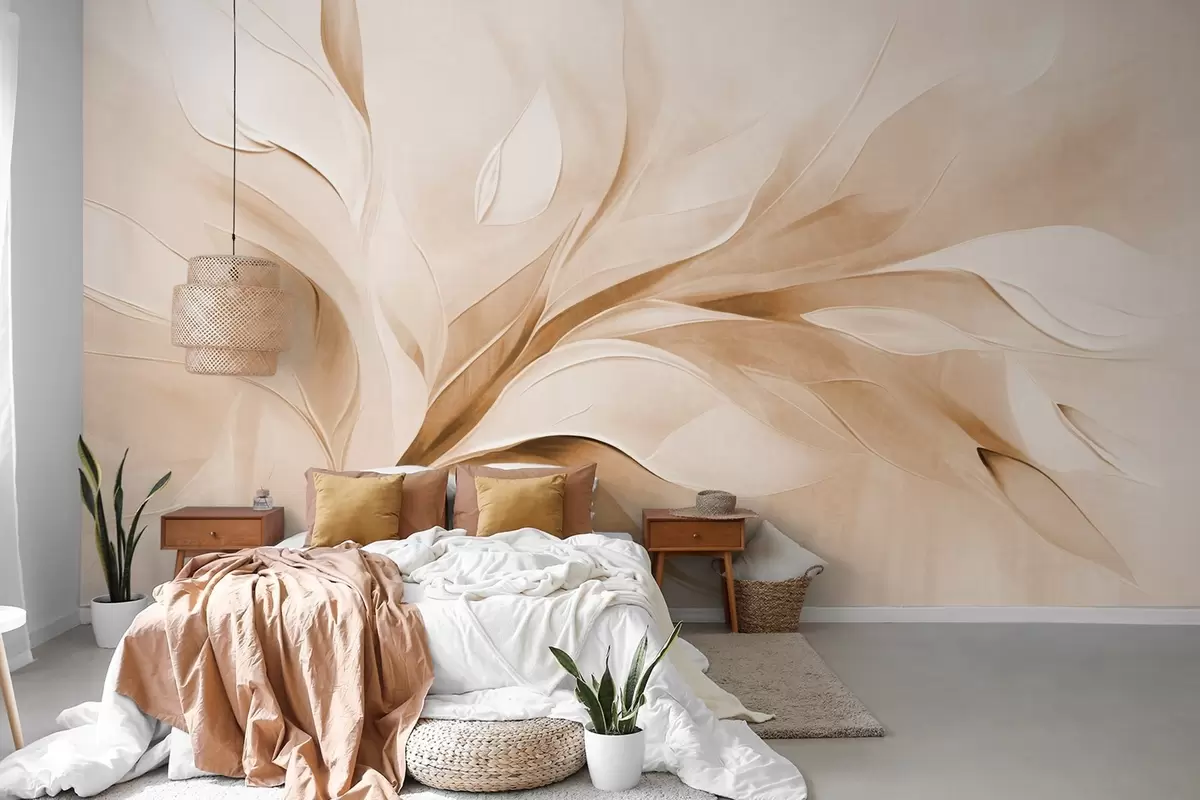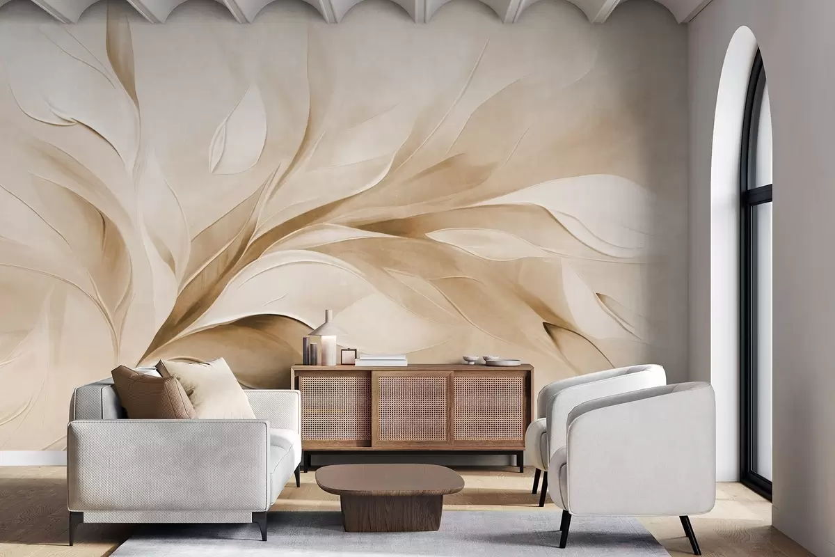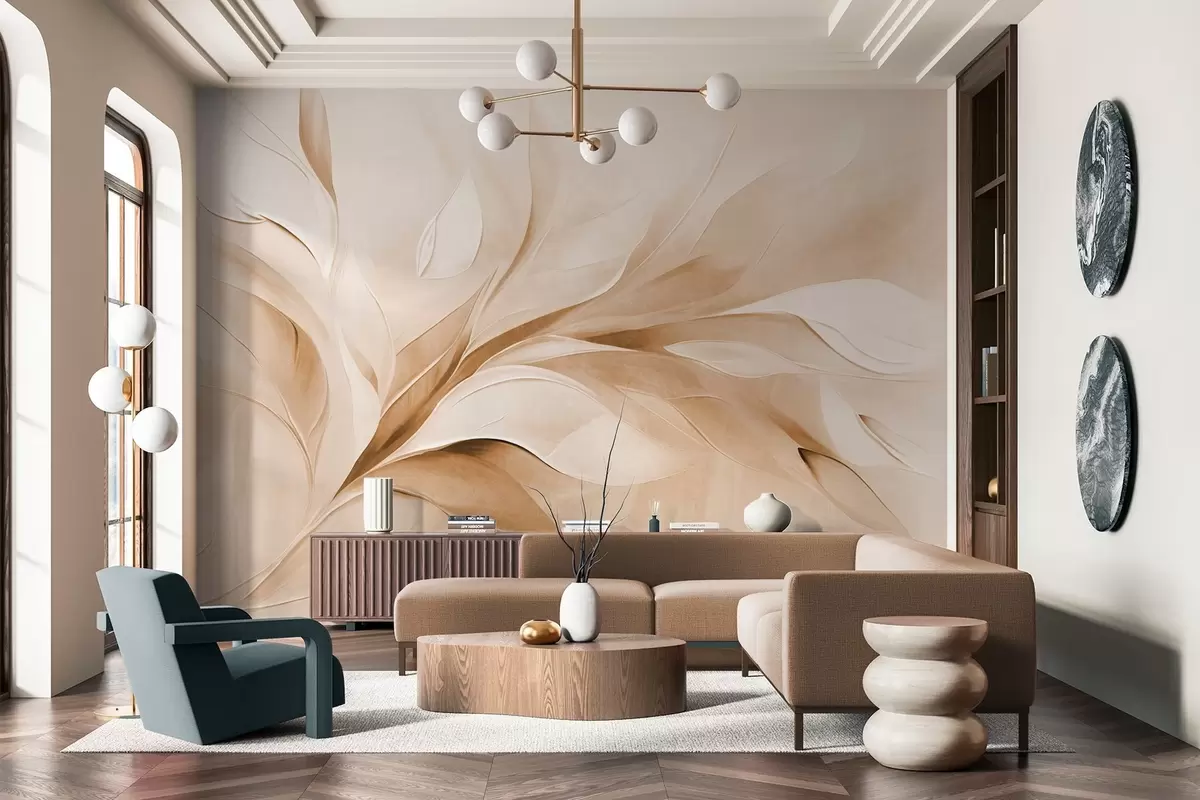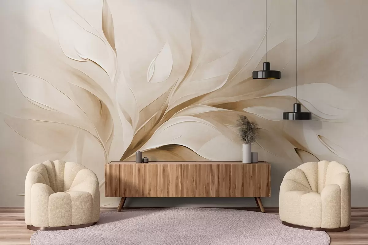 Murais de parede Pintura abstrata com textura em tons de bege e branco, com folhas fluidas Nr. w09765v1