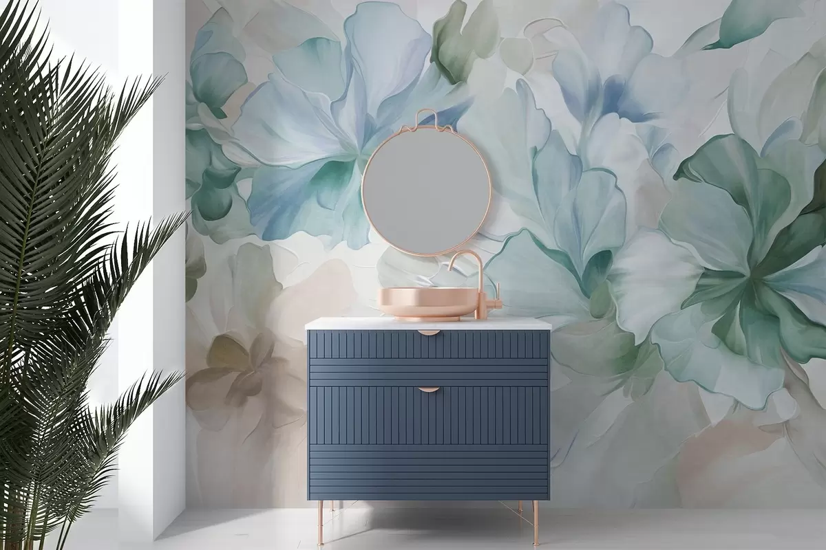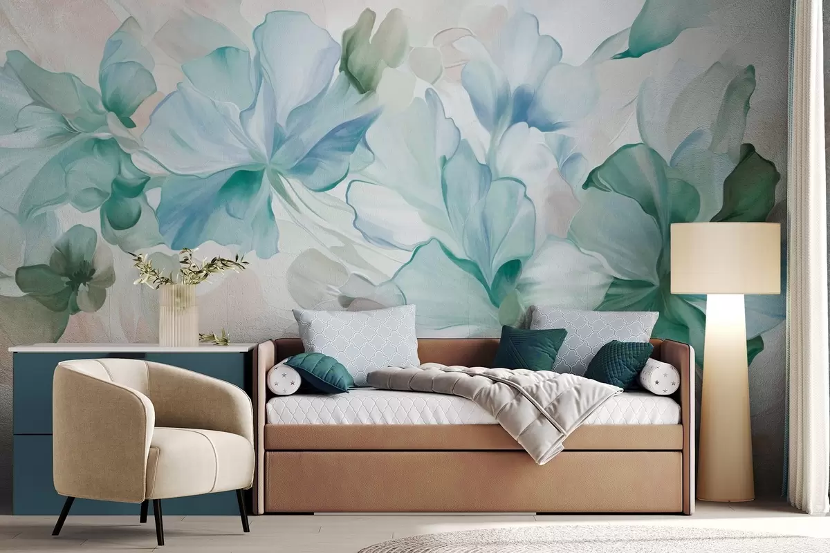 Murais de parede Flores abstratas e fantásticas em tons de verde, azul e bege, em estilo pictórico, arte texturizada Nr. w09767v1