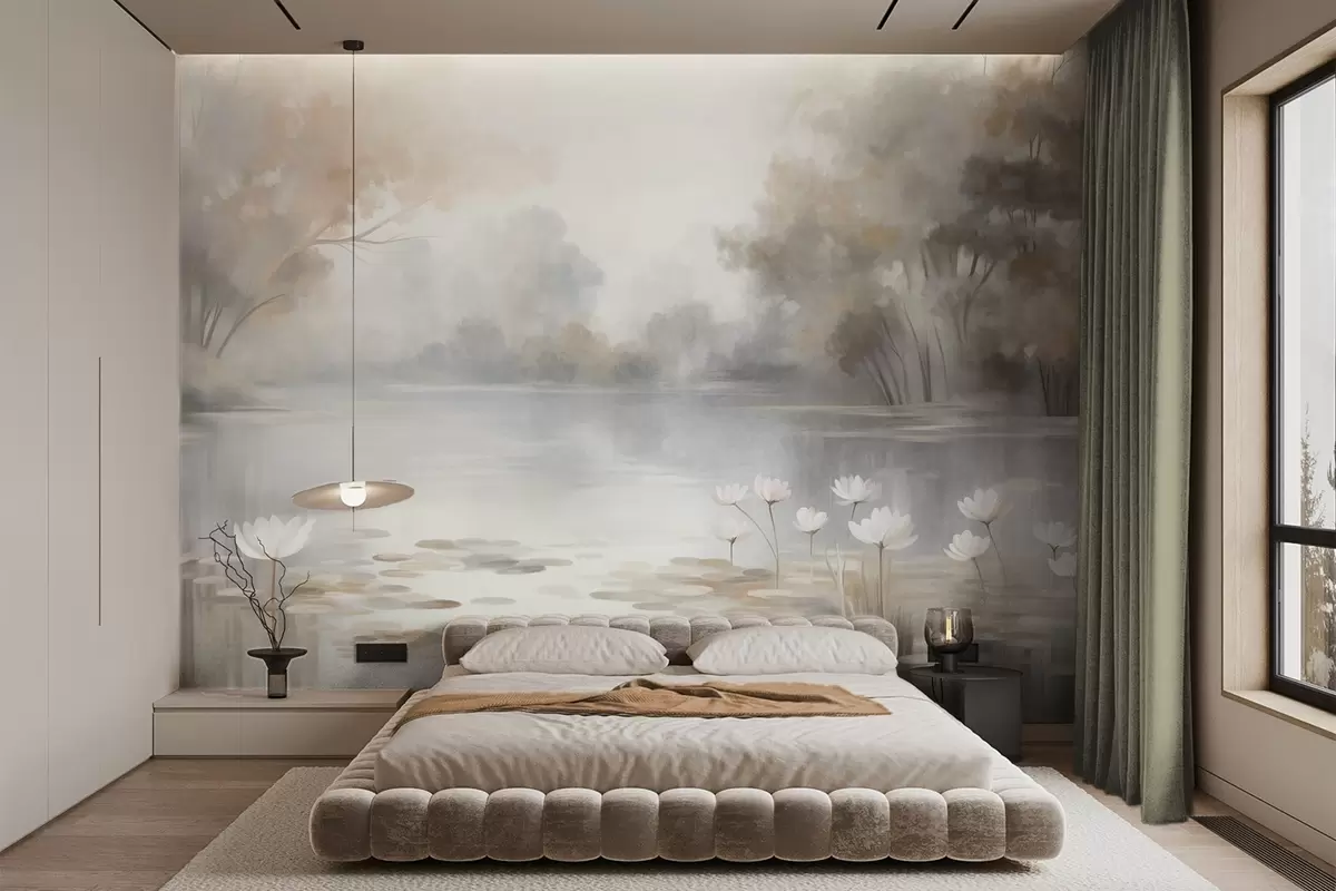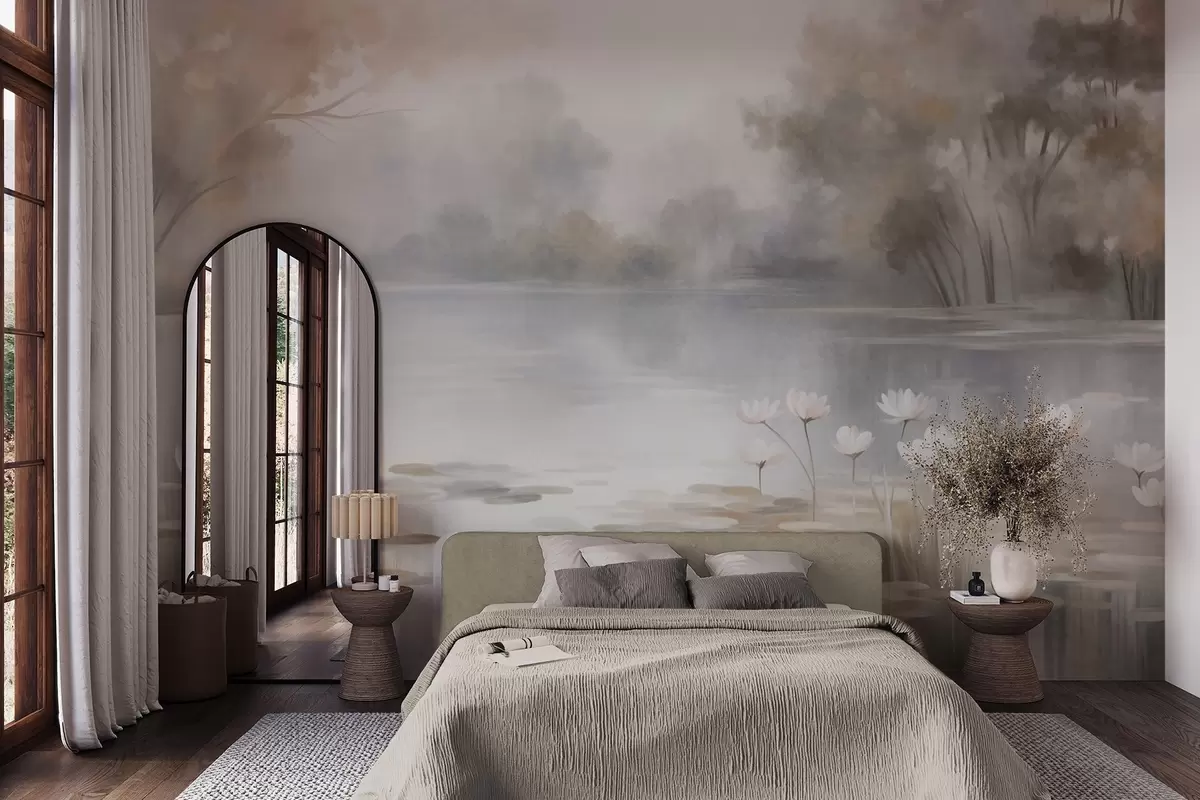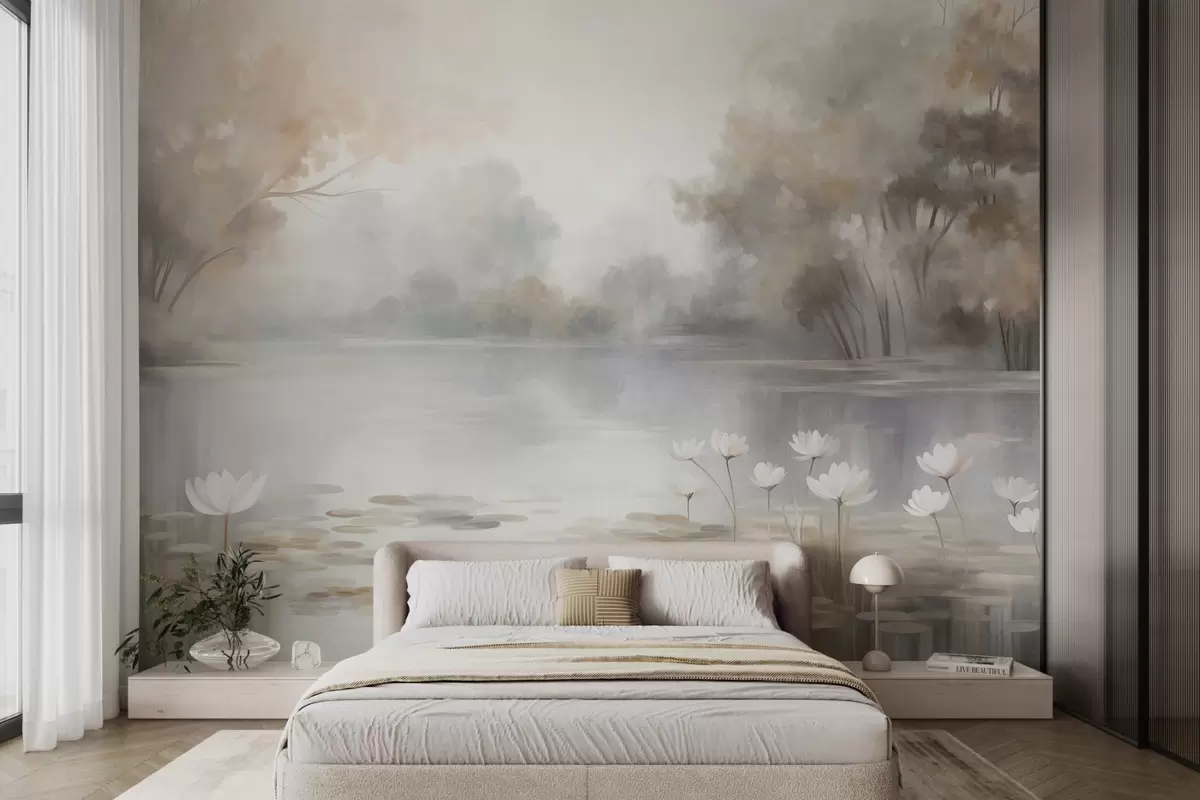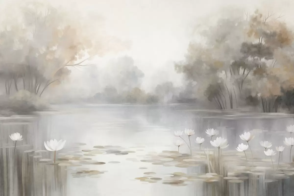 Murais de parede Paisagem texturizada, lago com nenúfares brancos, rodeado por árvores em tons suaves Nr. w09768