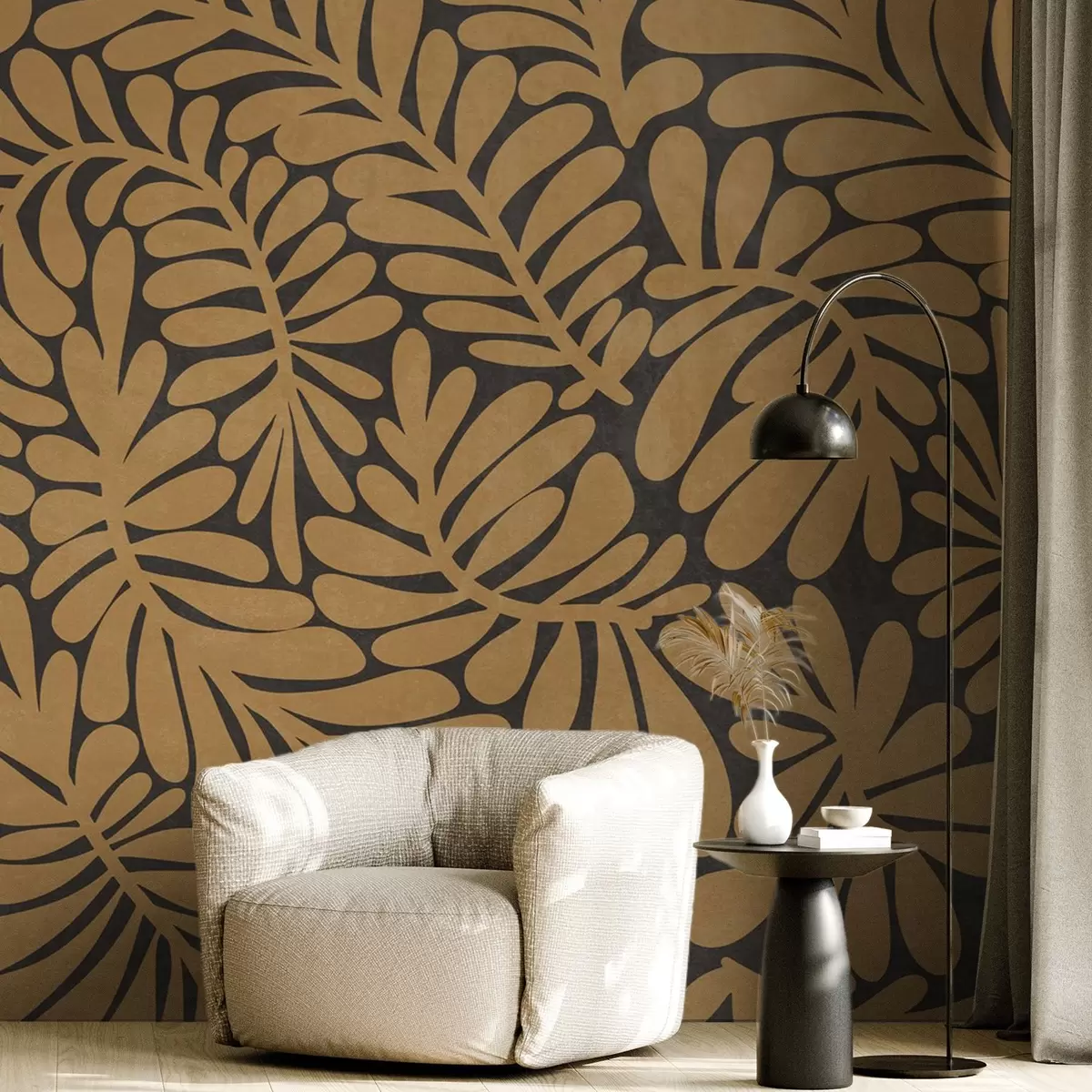 Murais de parede Folhas amarelo-mostarda estilizadas sobre um fundo cinza escuro, arte texturizada Nr. w09775