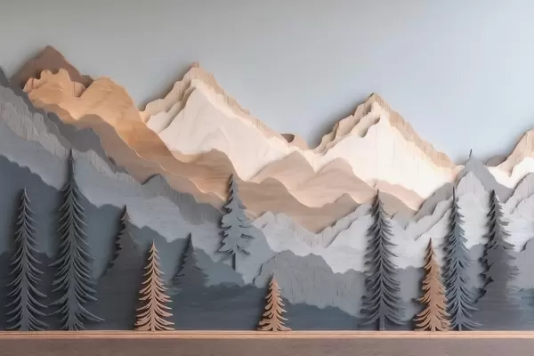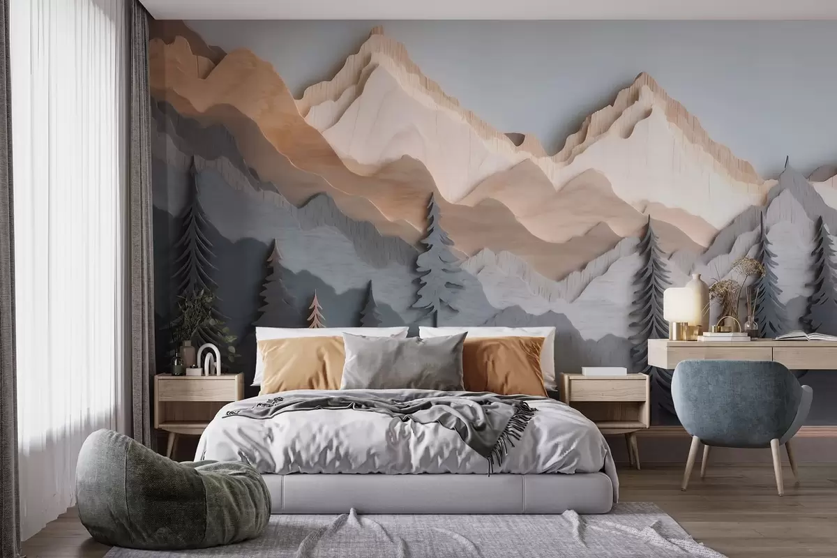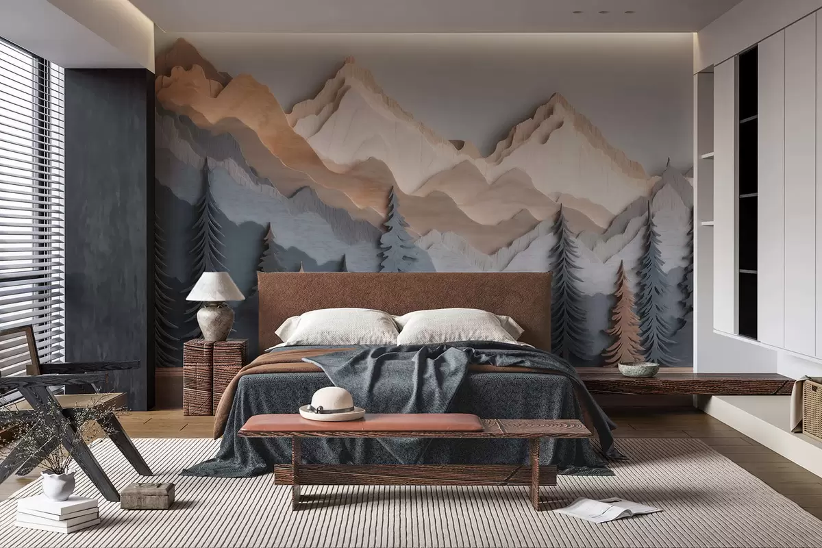 Murais de parede Paisagem natural com pinheiros e montanhas em estilo de madeira entalhada Nr. w09793