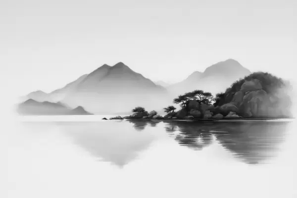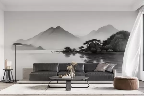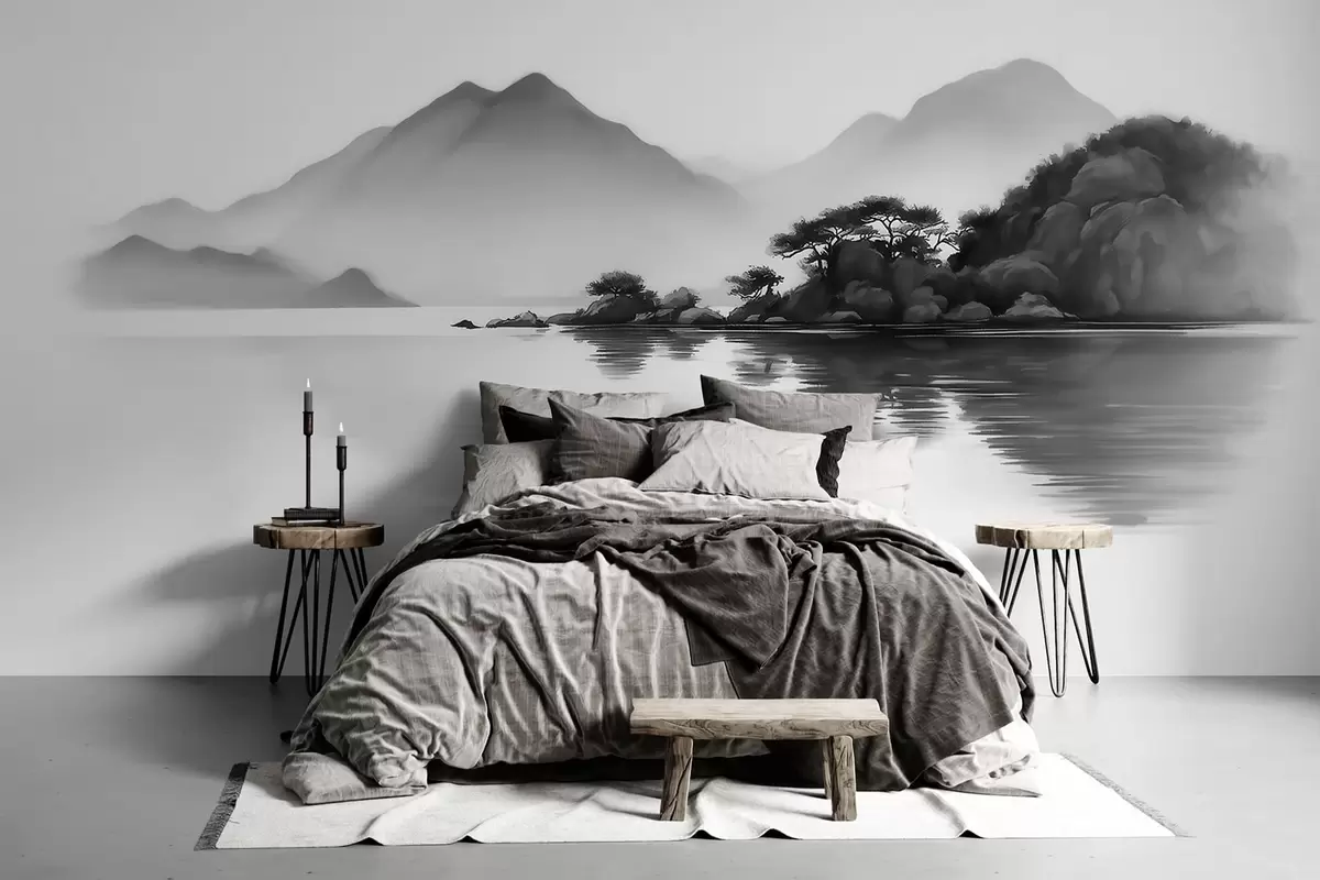 Murais de parede Paisagem em preto e branco com montanhas e um lago envoltos por uma névoa suave Nr. w09803