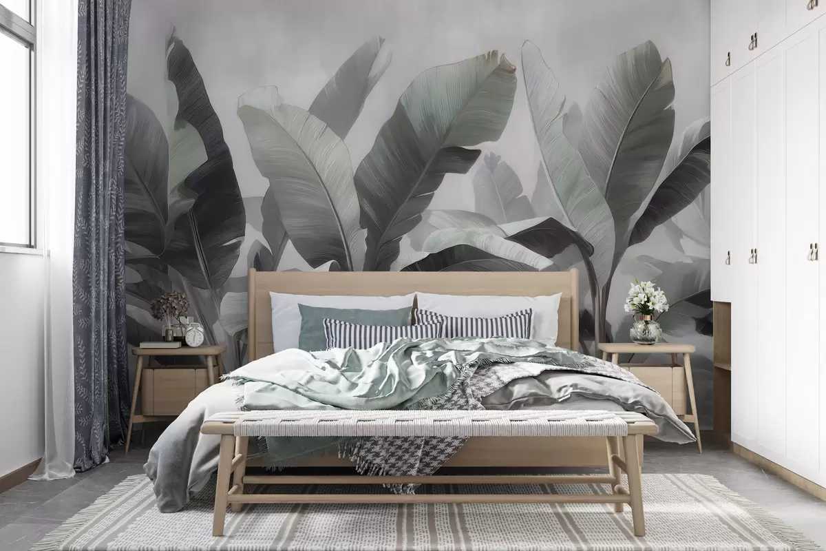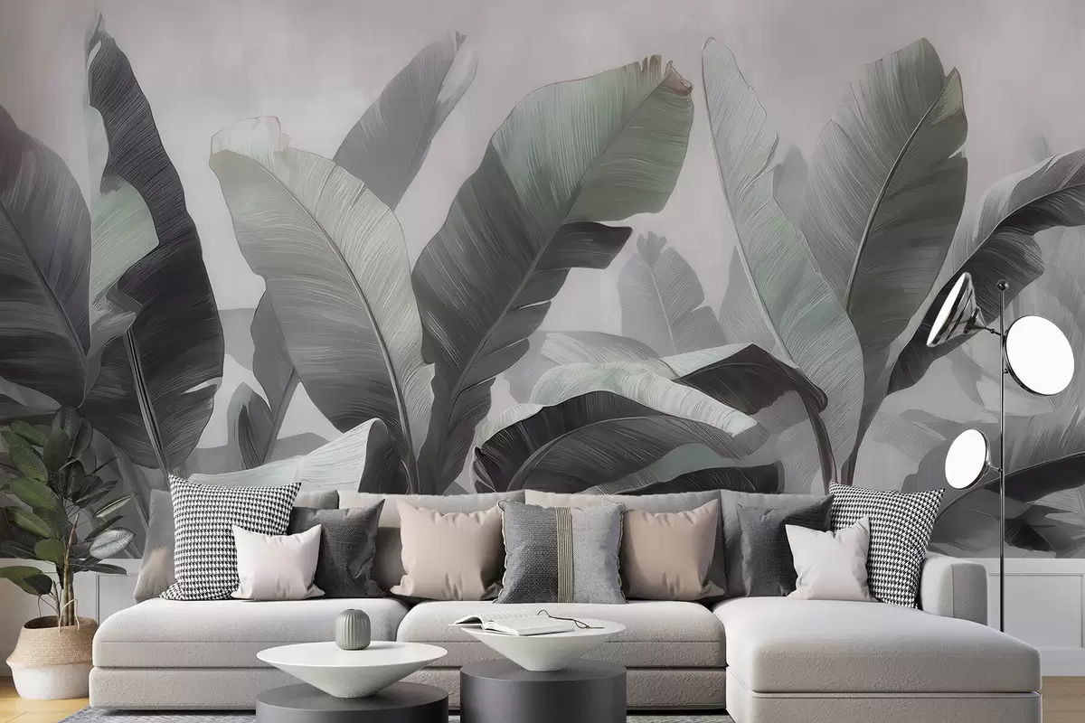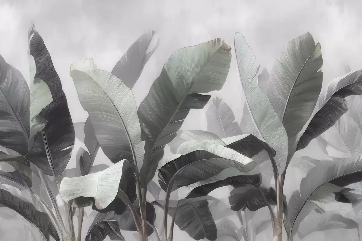 Murais de parede Folhas grandes de bananeira em estilo abstrato, em uma paleta neutra com suaves tons de cinza-esverdeado Nr. w09805