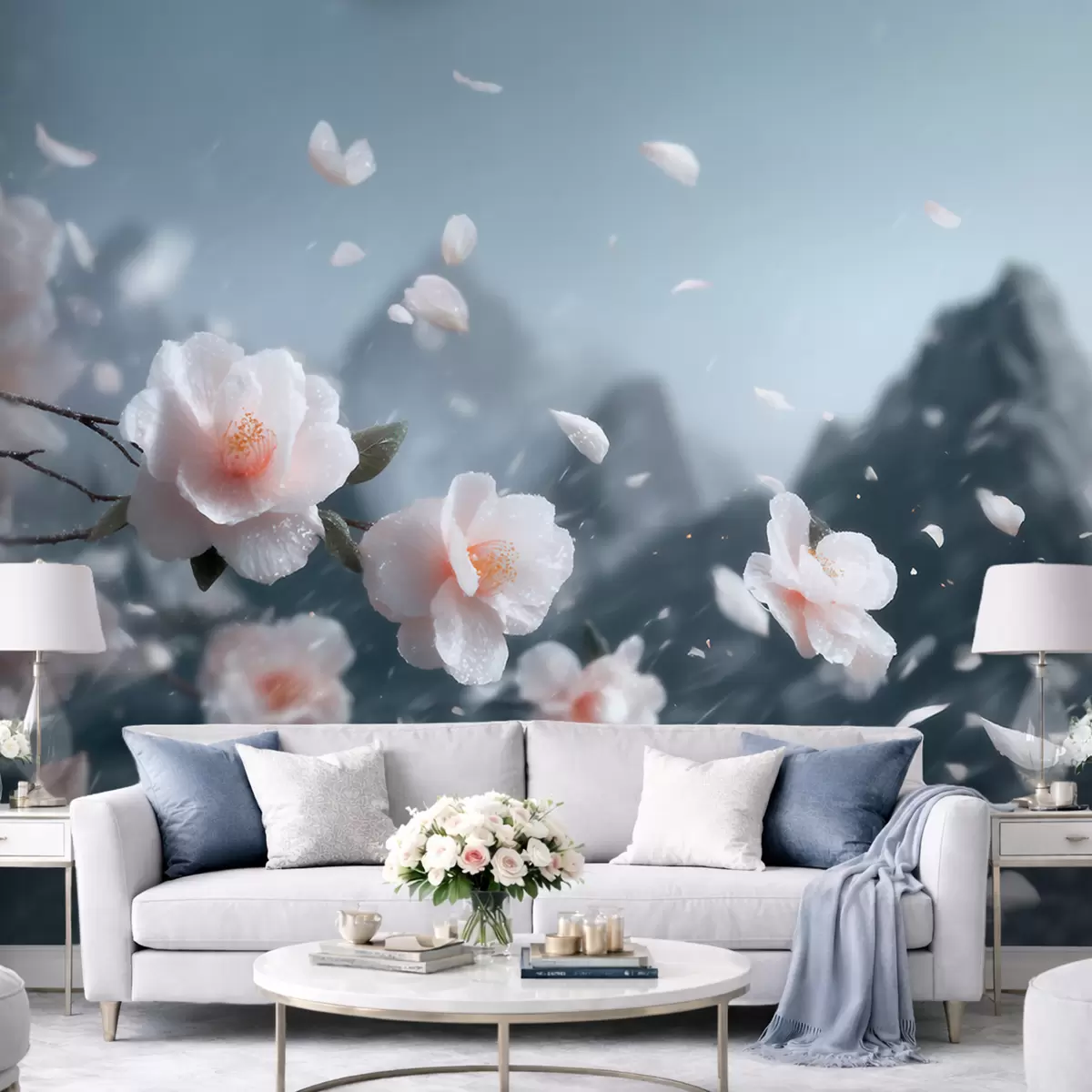 Murais de parede Delicadas flores de cerejeira em flor contra um cenário montanhoso, uma paisagem japonesa evocativa em tons pastéis Nr. w09808