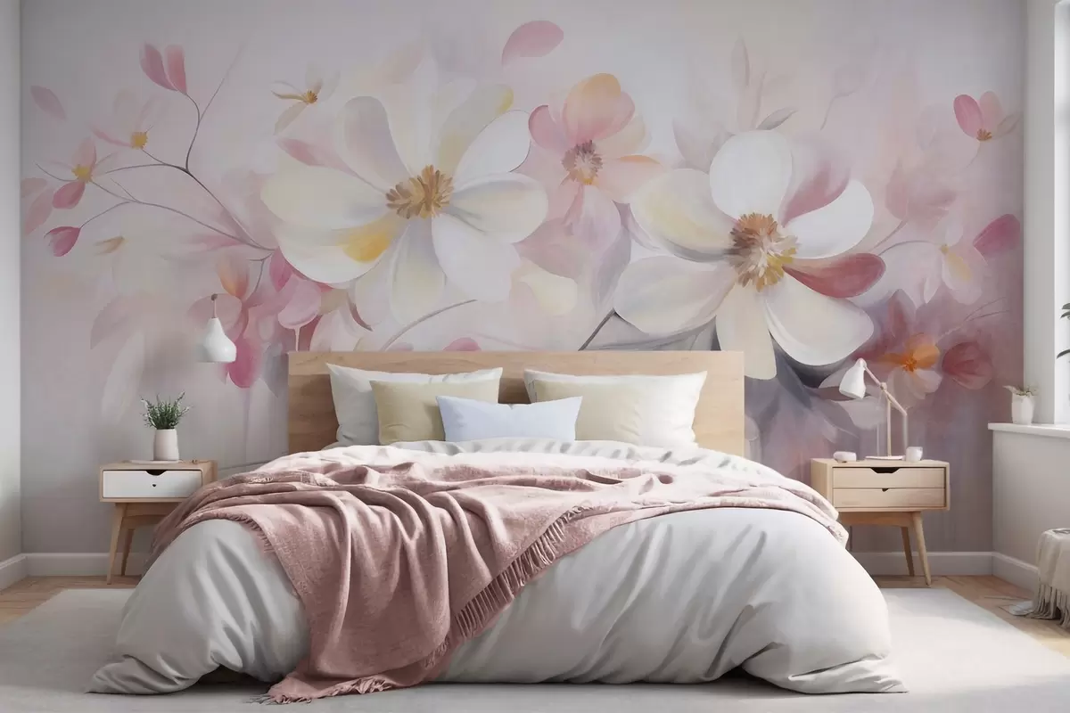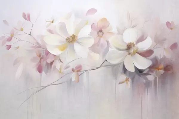 Murais de parede Arte com flores brancas e rosa de pétalas delicadas, fundo abstrato e suave Nr. w09811
