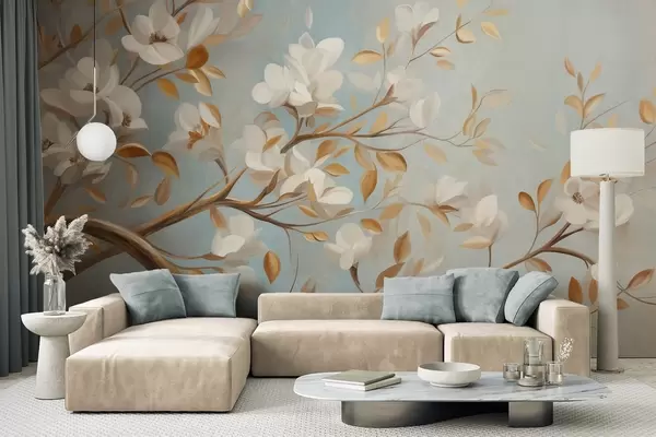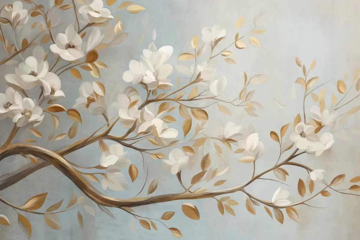 Murais de parede Galho de árvore texturizado com flores brancas e folhas amarelas, estilo vintage Nr. w09814