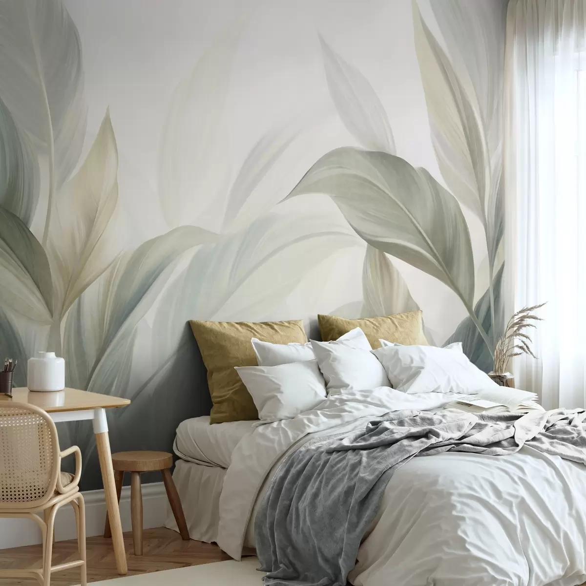 Murais de parede Folhas tropicais grandes, de cor verde-claro, com tons suaves e pastéis, em arte texturizada Nr. w09816
