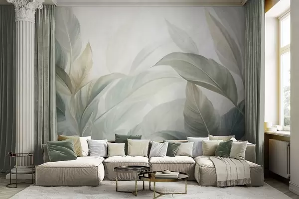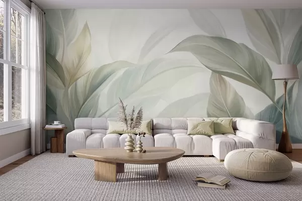Murais de parede Folhas tropicais grandes, de cor verde-claro, com tons suaves e pastéis, em arte texturizada Nr. w09816