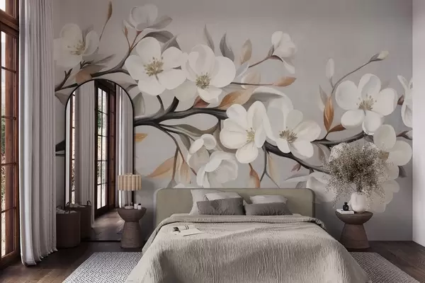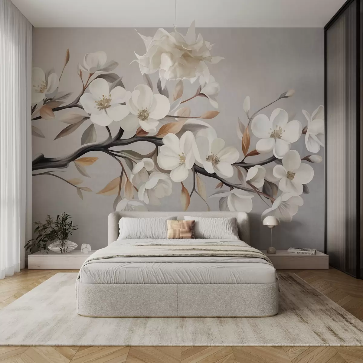 Murais de parede Galho texturizado com flores brancas e folhas marrons sobre um fundo cinza claro Nr. w09817