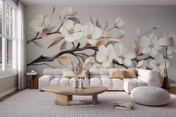 Murais de parede Galho texturizado com flores brancas e folhas marrons sobre um fundo cinza claro Nr. w09817