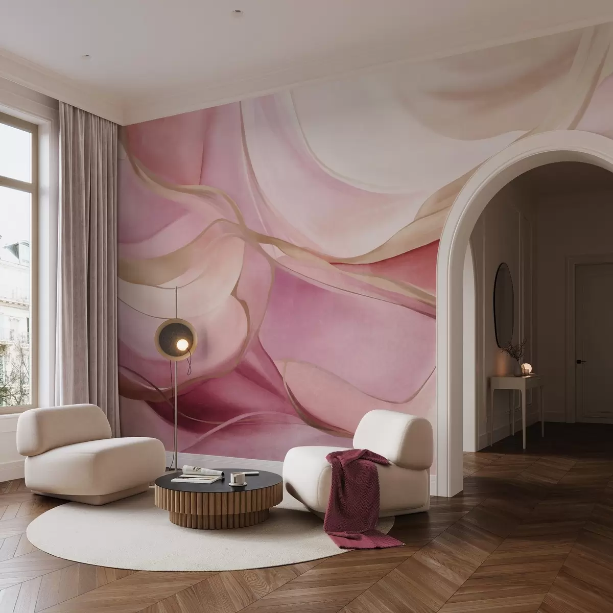 Murais de parede Formas fluidas com textura abstrata em tons de rosa e bege, com delicadas linhas amarelas Nr. w09818