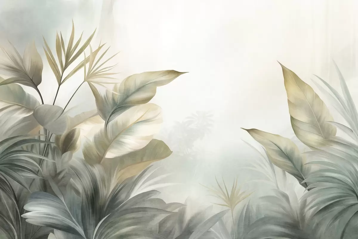 Murais de parede Folhas tropicais grandes e texturizadas em tons suaves de verde e bege, um ambiente de selva Nr. w09820